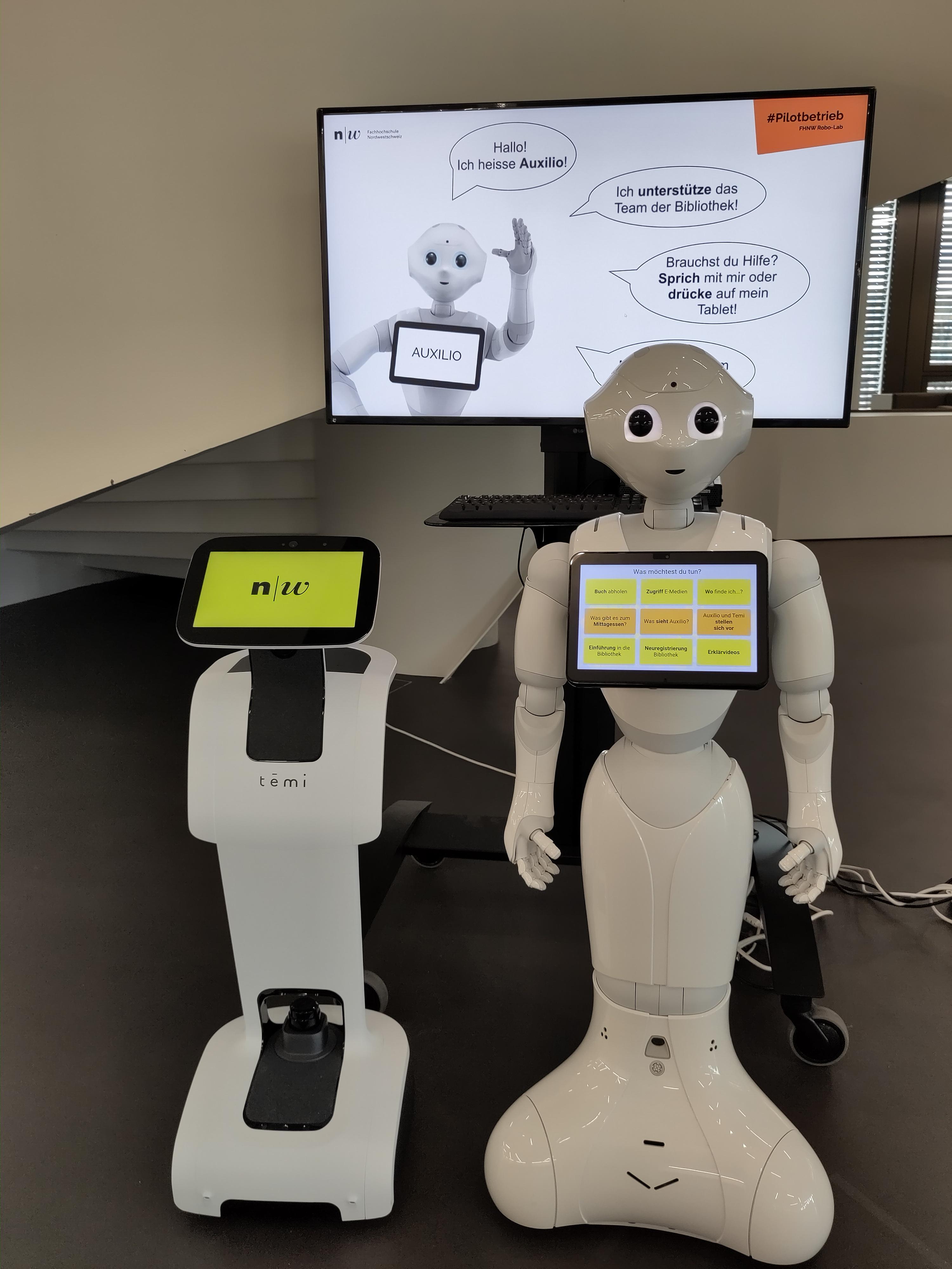 Der soziale Roboter Pepper unterstützt im Dauerbetrieb Mitarbeitende und Nutzende in der Bibliothek und wird dabei in einem partizipativen Prozess laufend weiterentwickelt. «Auxilio» ist seit Dezember 2019 in Brugg-Windisch im Einsatz, «Pepper-Mint» seit September 2020 in Muttenz. Seit Januar 2023 unterstützt der etwas weniger niedliche Roboter «Temi» Auxilio in Brugg-Windisch.