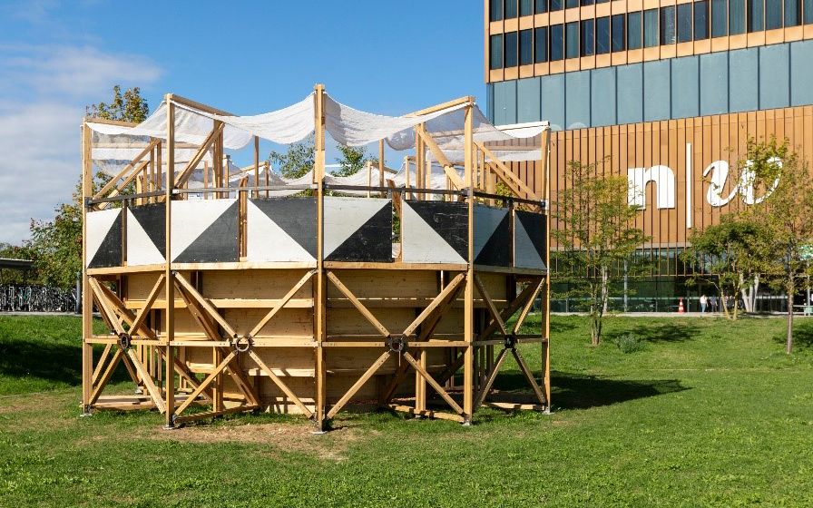 Seit September 2022 ist der FHNW Campus Muttenz um einen Aufenthaltsort im Freien reicher: Ein von Studierenden entworfener Pavillon aus Holz ziert den Campus-Park und dient den Angehörigen der FHNW sowie allen Anwohnenden als vor Wind und Sonne geschützter Treffpunkt. Ganz im Sinne des Jahresthemas «Constructive Futures – Beyond Concrete» des Instituts Architektur setzten sich Studierende im Rahmen eines Wettbewerbs mit der Wiederverwendung von Baumaterialien auseinander, die einst für den Bau einer Holzrampe verwendet wurden. Daraus resultierte die «Arena Zirkulär», welche in interdisziplinärer Zusammenarbeit der Institute Architektur, Bauingenieurwesen und Geomatik entstand.