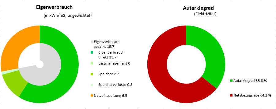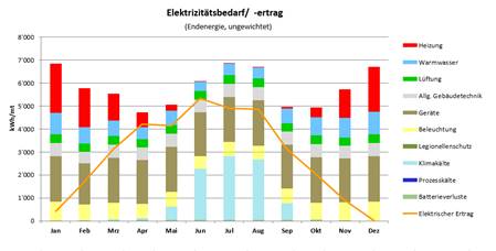 Das berechnete Gebäude kann aus bis zu 4 unterschiedlichen Nutzungszonen bestehen und bis zu drei Wärmeerzeuger enthalten. Neben den maximal drei Photovoltaik-Anlagen können auch ein elektrischer Speicher und der Bedarf von Raumkühlung und Prozesskälte mit einbezogen werden.