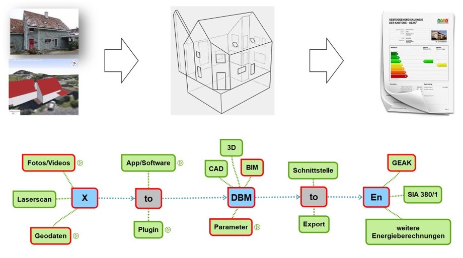 Aus diesem Projekt soll eine Wegleitung zur Umsetzung einer kosten- und zeiteffizienten Erfassung von Bestandsgebäuden als digitales Bauwerksmodell für Energiekonzepte resultieren. Derzeit sind bereits partielle Lösungen existent, es fehlt jedoch eine Zusammenführung von vorhandenen Ansätzen zu einer integralen Lösung.
