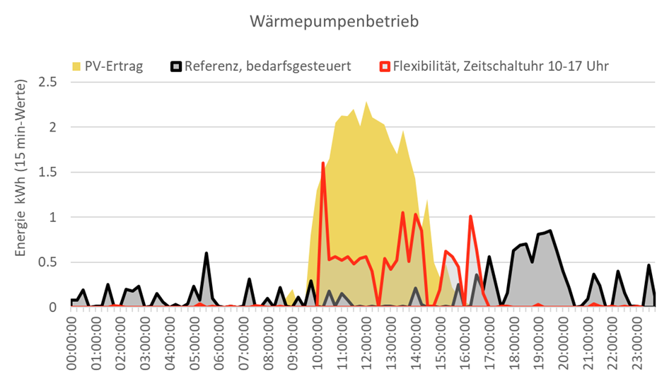 Um den Eigenverbrauch zu erhöhen ist es das Ziel, die Laufzeit der Wärmepumpe auf den Tag zu beschränken. Dies ist im Wohnbereich besser umzusetzen als im Bürobau, da im Bürobau die internen Lasten eine sehr grosse Rolle spielen. Im Winter führen hohe interne Lasten zu kürzeren Laufzeiten. Im Sommer verlängern hohe interne Lasten die Laufzeiten, da mehr bzw. länger gekühlt werden muss. Es wird ein Diagramm entwickelt, aus dem die Wärmepumpenlaufzeit für Wohnen in Abhängigkeit von dem Heizwärmebedarf und der Wärmespeicherfähigkeit abgeleitet werden kann.