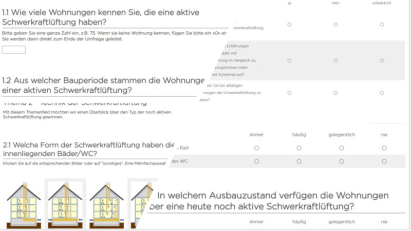 Da die Schwerkraftlüftung umstritten ist, aber wenig konkrete Informationen vorhanden sind, soll eine bessere Informationslage geschaffen werden. Hierzu wird eine Online-Umfrage bei Wohnbaugenossenschaften durchgeführt. Diese soll zu einem Kenntnisgewinn zur Verbreitung, der eingesetzten Technik und der Nutzerzufriedenheit von Schwerkraftlüftung in innenliegenden Bädern führen.