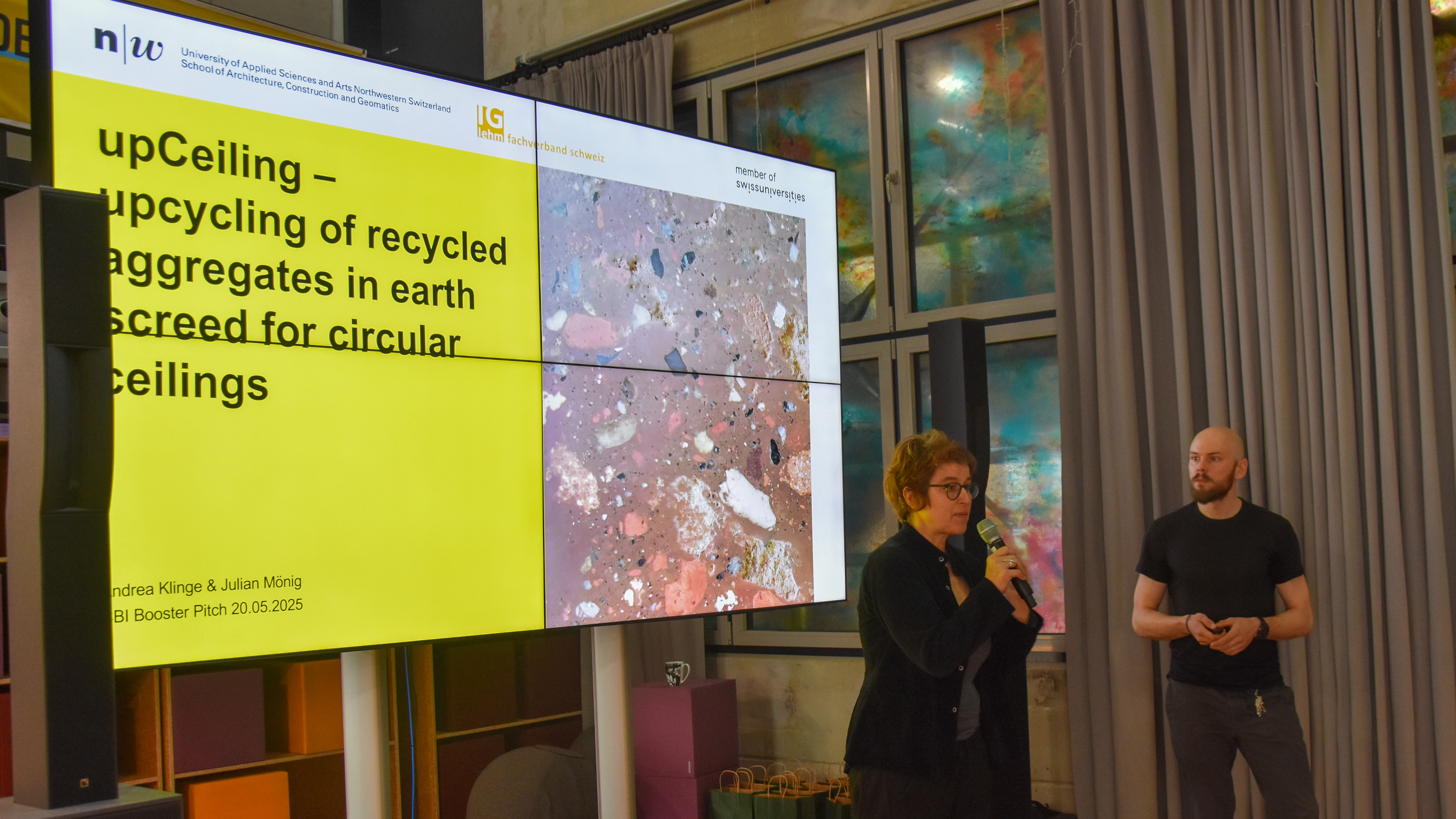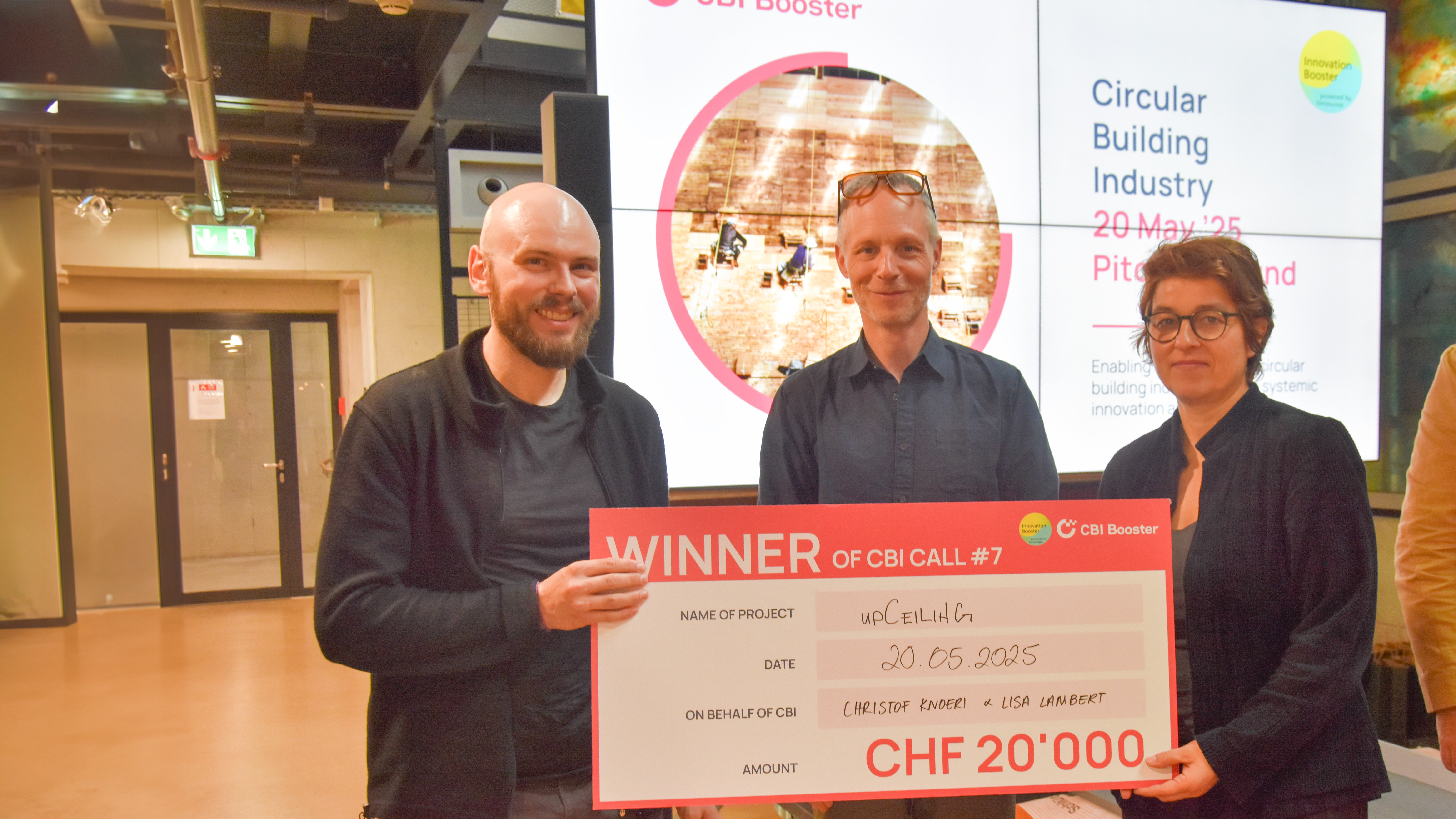 Wir gratulieren Andrea Klinge und Julian Mönig vom Institut Nachhaltigkeit und Energie am Bau INEB | FHNW herzlich zur Gewinnenden Auswahl beim CBI CALL #7 mit einem Funding in Höhe von 20'000 CHF! Beim Circular Building Industry Innovation Booster (CBI Booster) Pitching Event am 20. Mai im ETH Student Project House überzeugten sie mit ihrem Projekt upCeiling – und zählen damit zu den 15 prämierten Teams, die mit ihren Ideen einen wichtigen Beitrag zur Transformation der Bauwirtschaft leisten. Der von Innosuisse unterstützte CBI Booster vernetzt Bauwirtschaft, Forschung und Planung, um gemeinsam Lösungen für eine zirkuläre Bauzukunft zu entwickeln – von Materialien über Prozesse bis zu neuen Geschäftsmodellen.