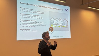 Dominik Born, Innovationsmanager bei IWB, stellte sogenannte Nanoverbünde vor: koordinierte lokale Wärmenetze, in denen bestehende Heizsysteme verknüpft, ergänzende Wärmepumpen eingesetzt und Wärme zwischen mehreren Gebäuden ausgetauscht wird.