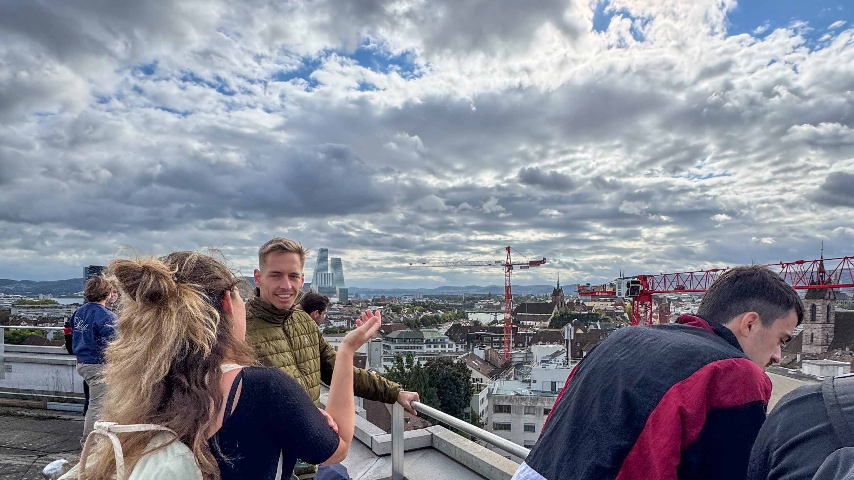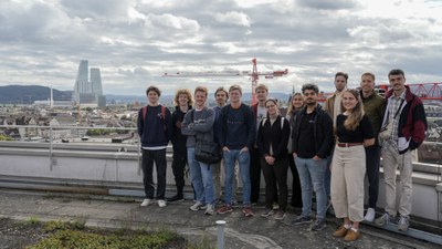 Der Abschluss des Ausflugs führte auf das Dach des Unispitals Basel – mit einem Rundumblick über Basel: die Altstadt, die aktuellen Baustellen des Spitals – und in der Ferne der FHNW Campus Muttenz. Zwischen Theorie und realer Baupraxis wurde deutlich, wie stark sich Stadt, Infrastruktur und Energieversorgung im Wandel befinden.