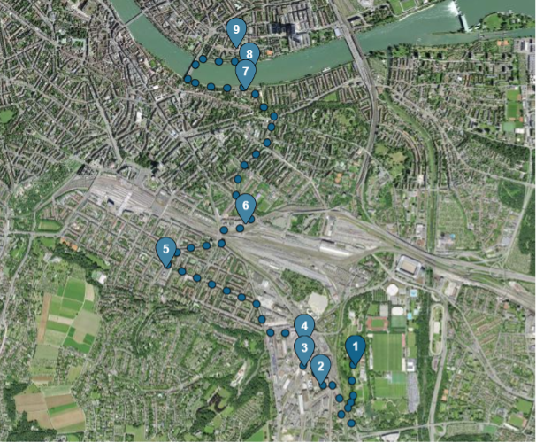 Der rund zweieinhalbstündige Spaziergang führet von den Meriangärten über das Dreispitz-Areal bis nach Grossbasel. Die Route verbindet historische Entwicklung mit aktuellen Transformationsprozessen im Basler Stadtraum. Ausgewählt wurden Projekte, die exemplarisch für ressourcenschonendes Bauen, Bestandsumnutzung und integrierte Energiekonzepte stehen.