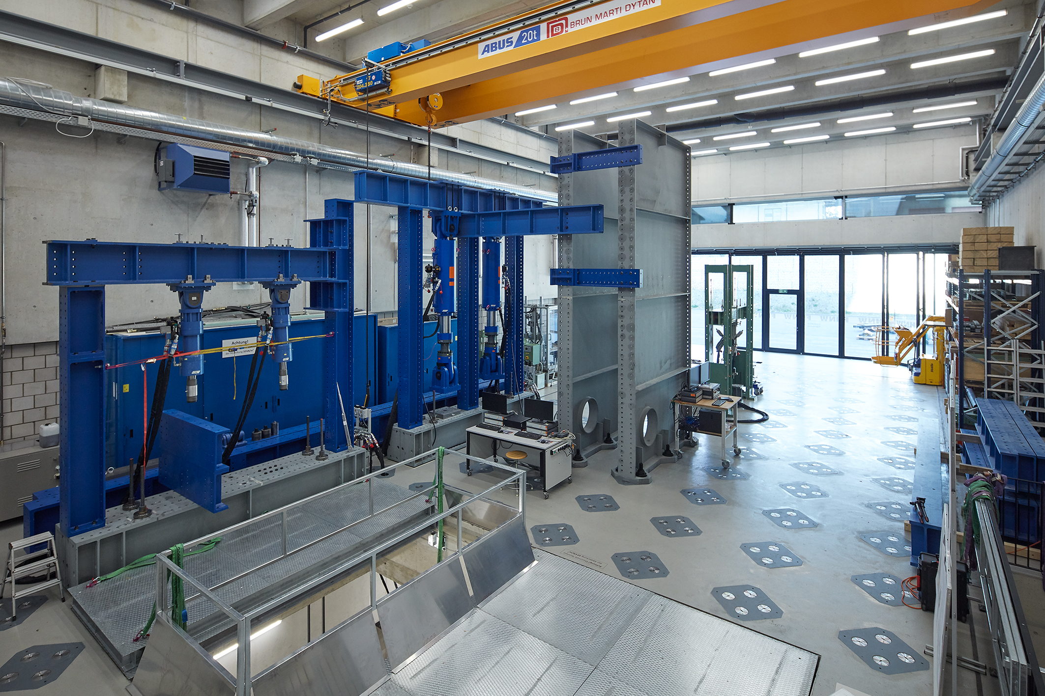 Die Hochschule für Architektur, Bau und Geomatik der FHNW verfügt über eines der grössten Labors an Schweizer Fachhochschulen – das Baulabor FHNW. Das Labor ermöglicht Lehre und Forschung in den Bereichen konstruktiver Ingenieurbau, Geotechnik und Wasserbau. Für Versuche steht im Baulabor eine 1,2 Meter dicke Stahlbetonplatte zur Verfügung. Dieser sogenannte Aufspannboden bildet das Rückgrat für Versuchsaufbauten im konstruktiven Ingenieurbau: Auf diesen Boden können Stahlkonstruktionen aufgeschraubt werden und mit Pressen – von bis zu 200 Tonnen – werden Träger, Stützen oder Wände aus Beton, Stahl oder Holz bis zum Bruch beansprucht.