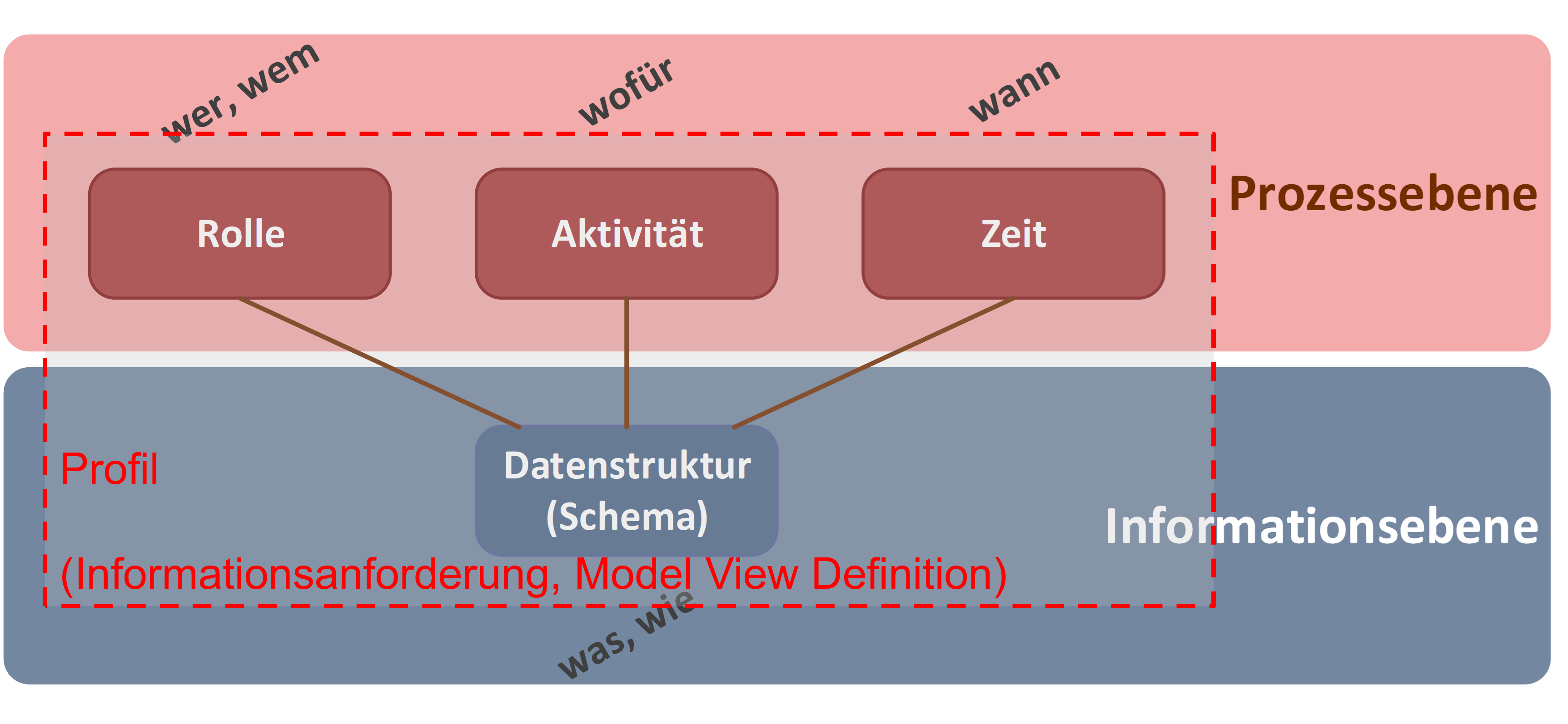 Die Fragen adressieren Aspekte aus zwei Ebenen: der Prozess- und der Informationsebene.