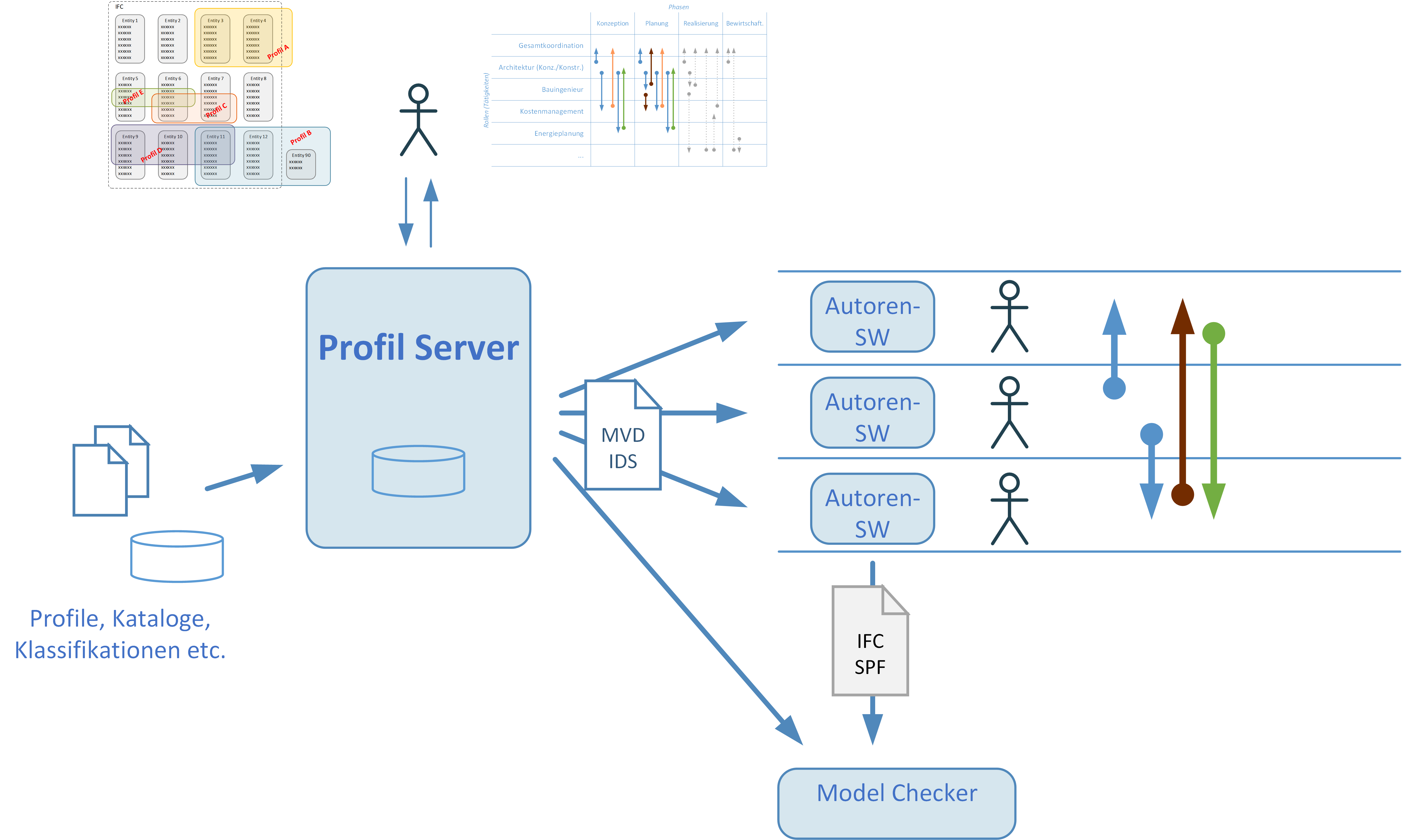 Der Profil-Server unterstützt mit seinen Funktionen die Fachpersonen (insbesondere BIM-Manager, BIM-Koordinator, Konstrukteure) für ein besseres Verständnis der Informationsanforderungen allgemein und des konzeptionellen Datenmodells IFC im Speziellen. Er trägt somit zu einer besseren Verständigung der am Datenaustausch beteiligten Parteien bei. Die Unterstützung wird erreicht, indem der Profil-Server die Datenaustauschprofile in einer anwendergerechten Form darstellen und bearbeiten lässt.