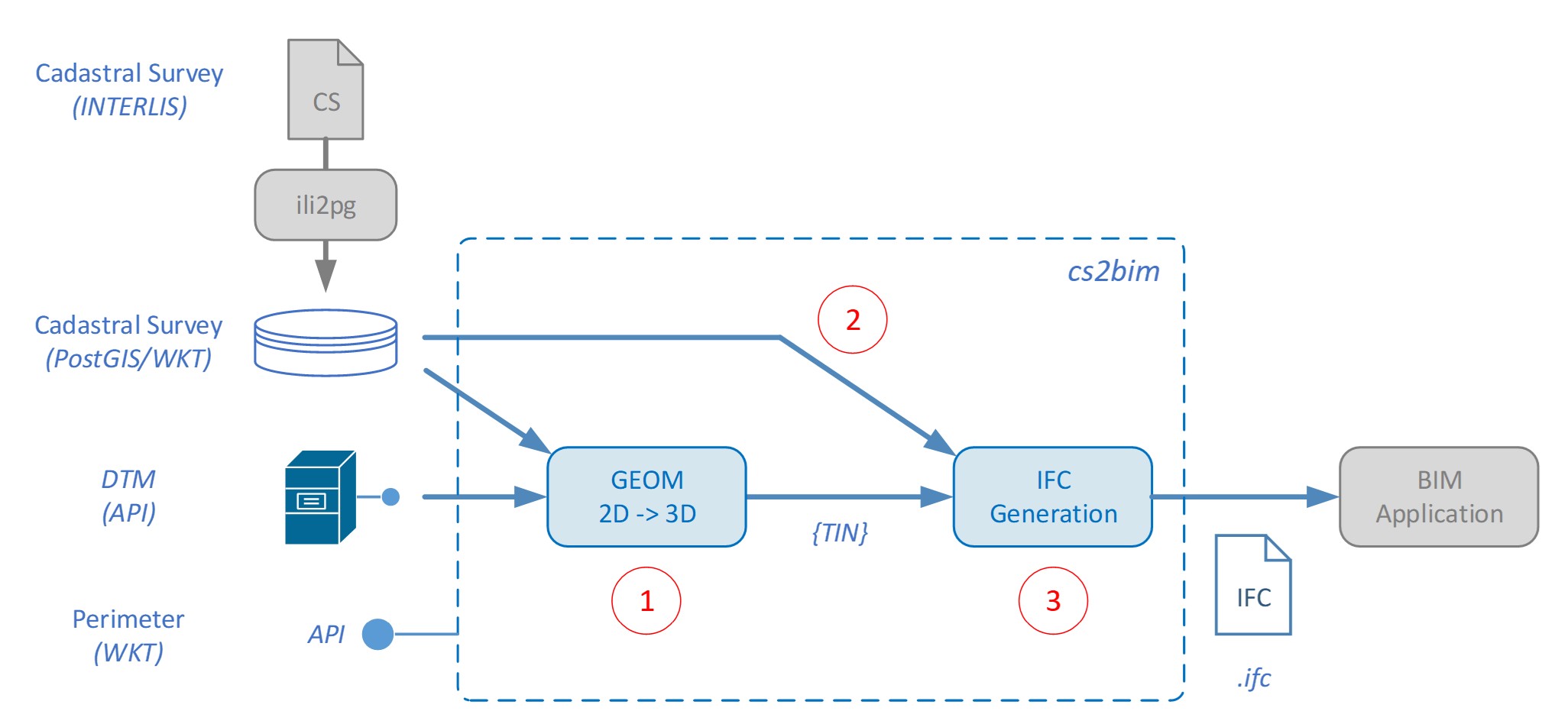 Im Forschungsprojekt «cs2bim» wird im Rahmen eines Direktauftrag ein open-source-Ansatz entwickelt, welches die Modelltransformation der amtlichen Vermessungsdaten der Schweiz von 2D nach 3D, flächendeckend für die Schweiz zur Verfügung stellt.