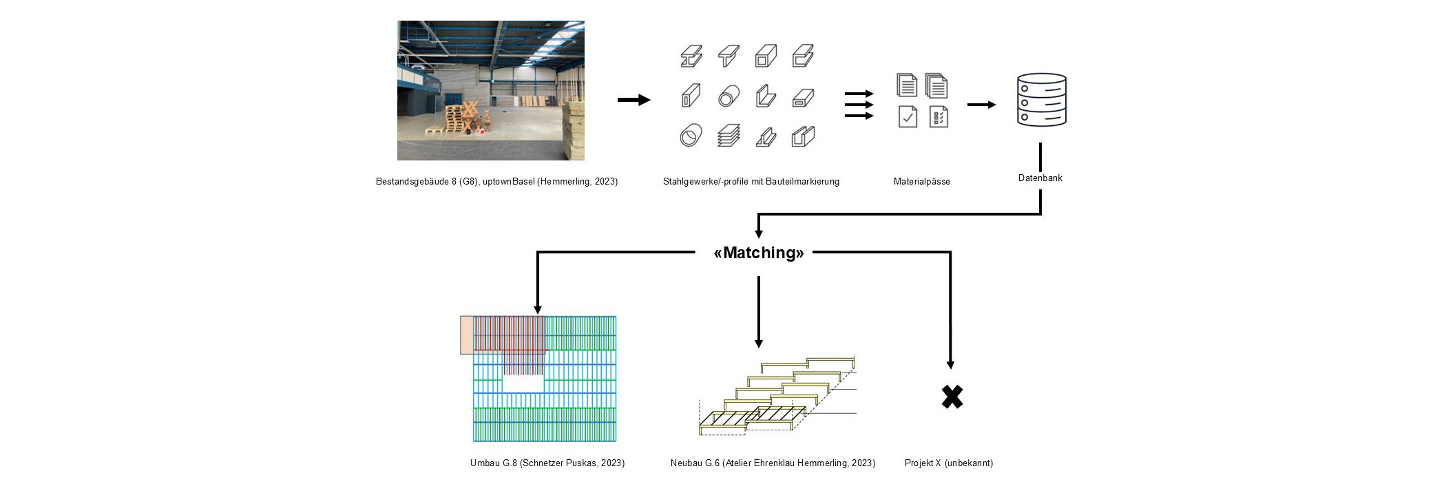 In uptownBasel ist grosses Potenzial für die lokale Wiederverwendung gegeben, denn Rückbauort, Werkhalle, Lagerplatz und Einbauort befinden sich auf demselben Areal. Beim teilweise zum Rückbau vorgesehenen Gebäude 8 handelt es sich um eine ehemalige Industriehalle mit einer sichtbaren und direkt zugänglichen Stahlstruktur. Dies ist insofern von Bedeutung, da Stahl viel Energie zur Herstellung benötigt und eine direkte Wiederverwendung von Stahlprofilen in einem Neu- oder Umbau zu einer Reduktion von Treibhausgasemissionen beitragen kann.