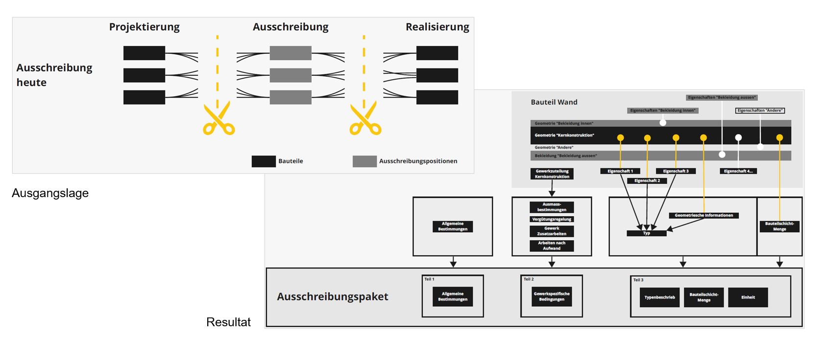 Das Konzept sieht vor, jedes Teilelement (Wandelement hat z.B. die Teilelemente: Mauerwerk, Bewehrung, Anker und Anschlüsse) aus dem digitalen Bauwerksmodell anhand von den hinterlegten Eigenschaften auszulesen. Die Daten werden in einem nächsten Schritt nach definierten Regeln sortiert und gruppiert. Dieses Vorgehen ermöglicht der Unternehmung dann einen spezifischen Einheitspreis für jeden Typ eines Teilelementes abzugeben. Dieser eingetragene Einheitspreis von der Unternehmung bildet die Grundlage für die Offerte. Im Hintergrund wird dann der Typ und dessen Einheitspreis auf die zutreffenden Teilelemente aufgeschlüsselt. Der Preis eines Teilelements wird mit einem Formelsatz aus der Menge und dem Einheitspreis errechnet. Aus den summierten Preisen der Teilelemente ergibt sich der Bauteil-Preis.