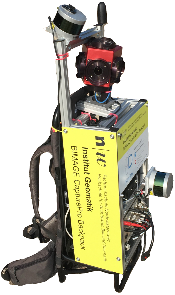 Entwicklung eines portablen Kamera-basierten 3D-Erfassungssystems BIMAGE Backpack mit Navigations- und Umgebungssensorik zur kinematischen Datenerfassung im Innen- und Aussenraum. Mit der integrierten Panoramakamera können pro Auslösung sechs Einzelbilder erfasst und anhand von LiDAR-SLAM-Algorithmen im 3D-Raum lokal positioniert und orientiert werden. Die Onboard-Erfassungssoftware erlaubt eine Fortschritts- und Qualitätskontrolle in Echtzeit auf einem mitgeführten Tablet (Blaser et al., 2018b). Entwicklung einer Simulationssoftware zur Evaluation optimaler Mehrkopf-Kamerakonfigurationen und Panoramagenerierung im Innen- und Aussenbereich.