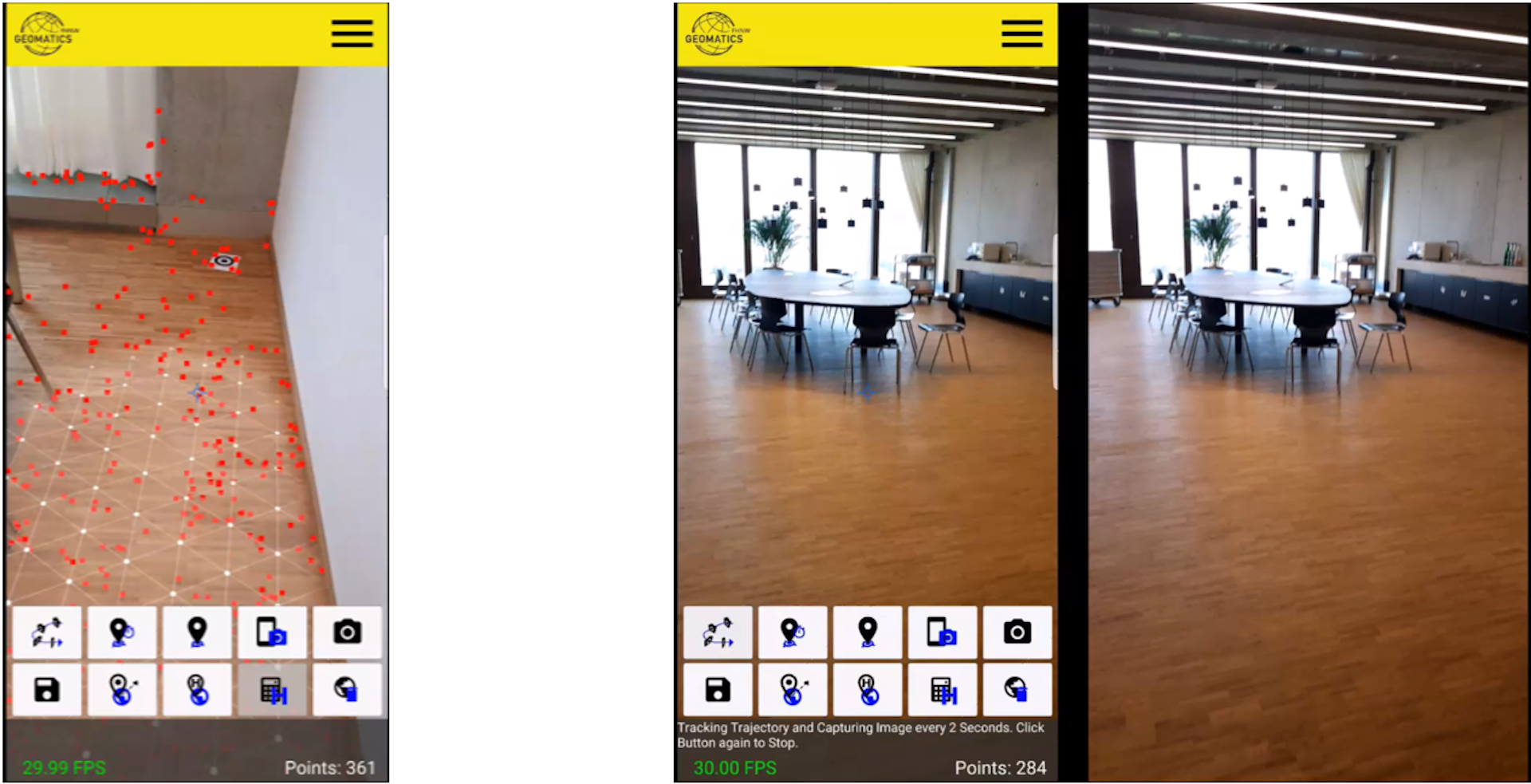 Abb. 1. AR-App mit absoluter Georeferenzierungsfunktionalität (links) sowie automatischer Bildaufnahme und -orientierung (rechts).