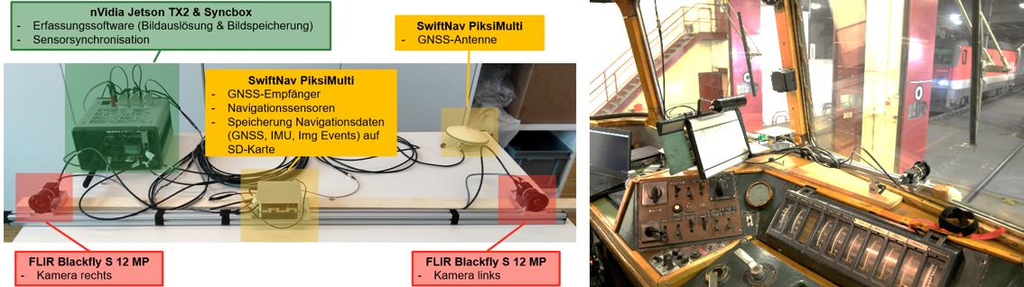 Abb. 2. Prototypisches stereobildbasiertes Erfassungssystem für die automatisierte, flächenhafte infra3D-Nachführung mit Fahrzeugflotten (links), Montage in einer ÖBB-Lokomotive im Rahmen des Pilotprojekts (rechts).
