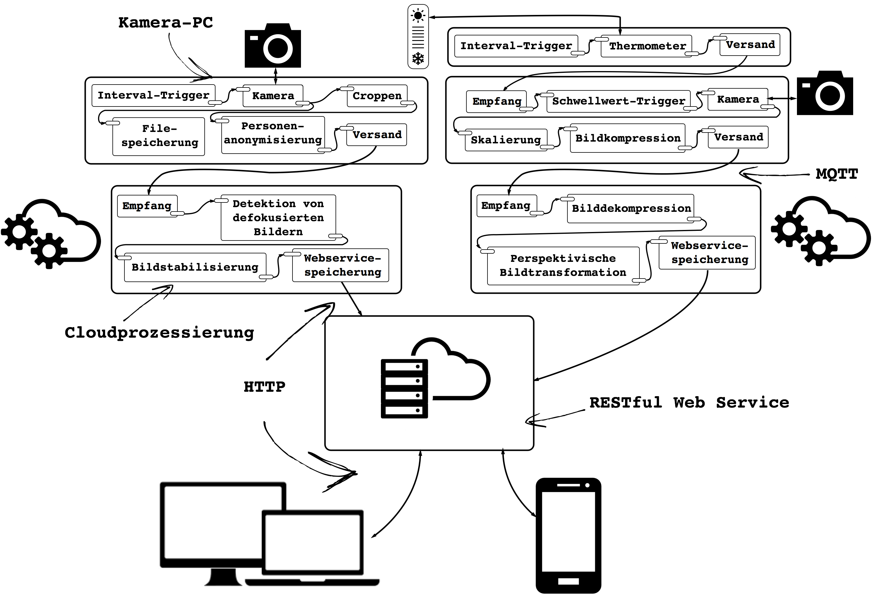 Detaillierte, bildbasierte Dokumentationen von, beispielsweise Baustellen oder meteorologischen Vorgängen, sind gefragt wie nie zuvor. Diese Bedürfnisse können heutzutage dank hochaufgelösten Kamerasystemen und grosser Bandbreite in der mobilen Datenübertragung bis zu einem gewissen Grad befriedigt werden. Jedoch sind diese Sensorinstallationen im Normalfall isolierte Einzellösungen und oft auf die spezifischen Anwendungen zugeschnittene teure Massanfertigungen. Die Entwicklungen der letzten Jahre von neuen Technologien für das Internet of Things (IoT) , zusammen mit der Rechenleistung von Kleinst-PCs und den Bandbreiten in der mobilen Datenübertragung, erlauben es heute die Kamerasystem-Massanfertigungen durch ein flexibel einsetzbares, modulares Netzwerk von Sensoren sowie Kommunikations-, Bearbeitungs- und Analysemodulen zu ersetzen. Neben Kameras können weitere Sensoren, z.B. für Helligkeitsmessungen, ins Netzwerk eingebunden und die gemessenen Werte unter anderem für die Steuerung von Ereignissen, wie der Kameraauslösung, verwendet werden. Ein solches System kann einfach an verschiedene Bedürfnisse angepasst, kostengünstig umgesetzt und wenn nötig modular erweitert werden.