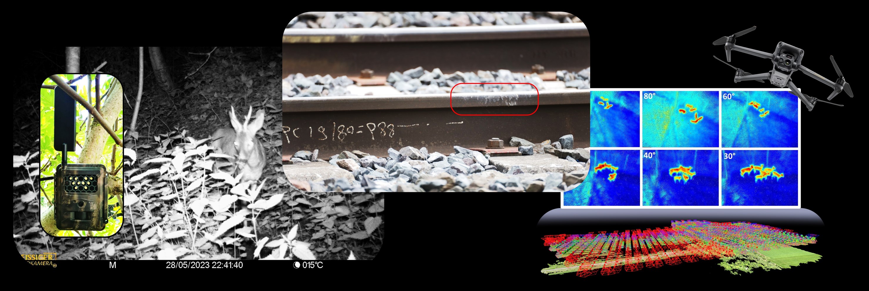 Erfassungsmethoden für «Ground Truth»-Referenzdaten: Kamerafalle (links), Sedimentspuren an stark frequentierten Wildwechseln (Mitte), Drohnenbefliegungen (rechts) - diese jeweils mittels Wärmebildkameras zur Populationsschätzung oder mittels Photogrammmetrie zur 3D-Modellierung von Habitaten in Risikogebieten.