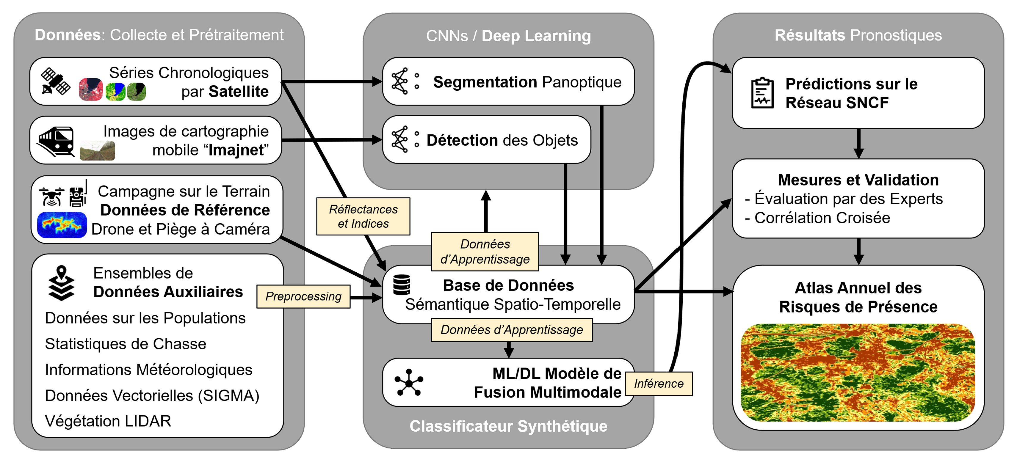Als Datengrundlage der Modelle nehmen Satelliten-Zeitreihen und Mobile Mapping eine Schlüsselrolle ein. Während hochauflösende Multispektraldaten des Sentinel-2 Satellitenprogramms der ESA je nach Bewölkung alle sechs Tage die Möglichkeit bieten, ein klassifizierbares Landschaftsmodell für ganz Frankreich zu berechnen, können Mobile Mapping-Bilder (Imajnet) verwendet werden, um besonders stark frequentierte Wildwechsel zu lokalisieren, die sich beispielsweise durch verfärbten Schotter bemerkbar machen. Zusätzliche modellrelevante Informationen sollen beispielsweise aus LIDAR-Punktwolken extrahiert, sowie aus landwirtschaftlichen, jagdlichen und klimatologischen Diensten integriert werden.