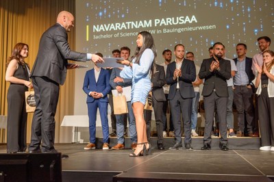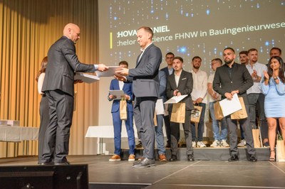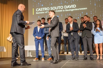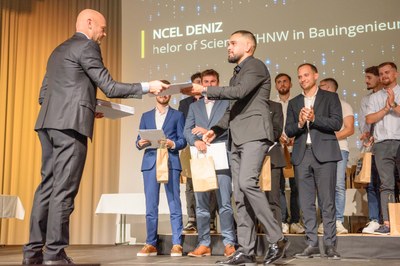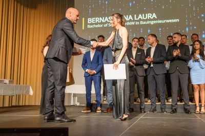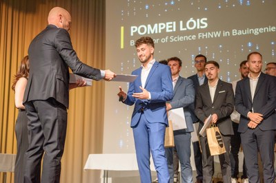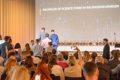 Die diesjährige Diplomfeier fand in der Aula des FHNW Campus Muttenz statt und erfolgte in zwei Gruppen. Prof. Nora Dainton, Leiterin des Master-Studienganges Virtual Design and Construction, dessen Absolvent*innen erstmals diplomiert wurden, führte durch den Abend. Neben einem Grusswort durch unseren Direktor Prof. Dr. Gerhard Schrotter standen auch Auftritte der Schweizer Soulsängerin Ira May und des Burgdorfers Remo Zumstein, mehrmaligem Vize- und Schweizermeister im Poetry Slam, auf dem Programm. Die feierliche Diplom- und Preisüberreichung erfolgte durch die Instituts- und Studiengangleitenden sowie Praxispartner*innen. Während dem abschliessenden Apéro konnten die Diplomierten ihren Erfolg gemeinsam feiern und den Abend gebührend ausklingen lassen.