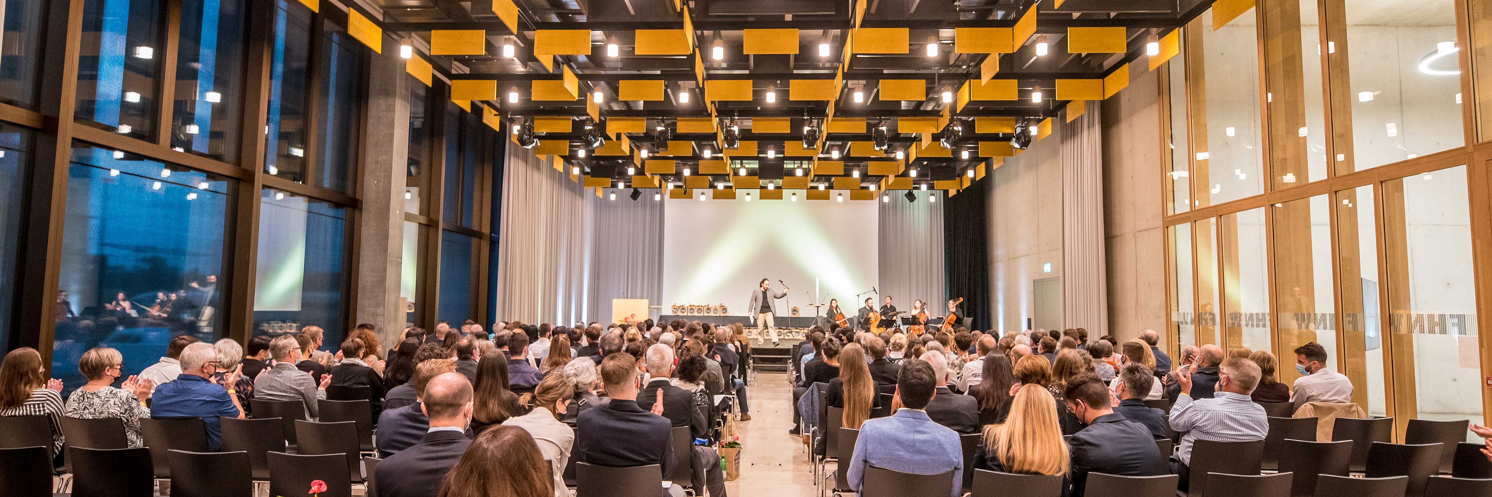 Für viele Lacher sorgte der Burgdorfer Remo Zumstein, der mehrmaliger Vize- und Schweizermeister im Poetry Slam ist und die Feier humorvoll umrahmte. Besonders in Erinnerung bleiben wird wohl dessen Schlusswort: «FHNW – das steht für: Feiert heute Nacht weiter!». Das Ensemble «Basel Celloquartett» der Hochschule für Musik FHNW sorgte zudem für einen stimmungsvollen Ein- und Ausklang.