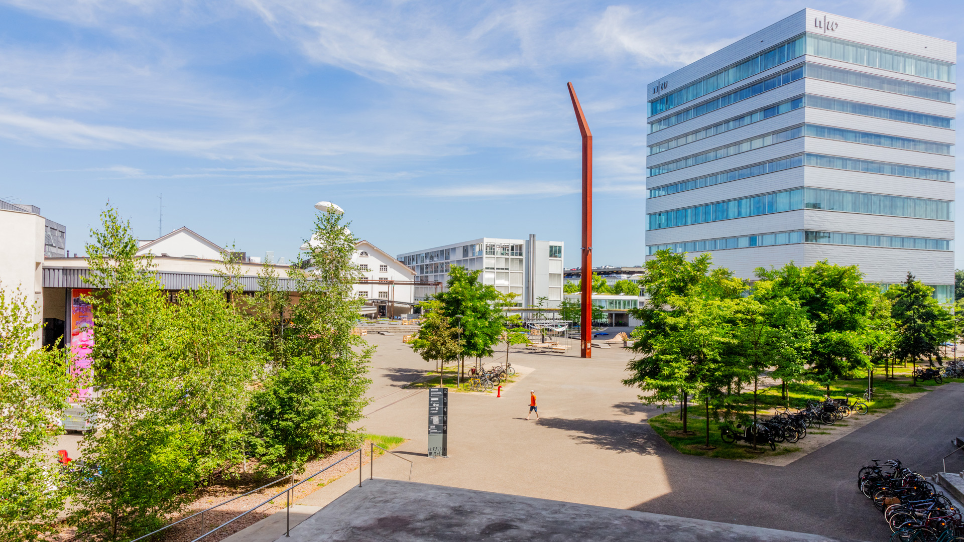 Ateliergebäude, Hochhaus, die Campus.Werkstätten, das FoodCultureLab, der Ausstellungsraum ‹ der TANK › befinden sich in kürzester Gehdistanz zueinander rund um den Freilager-Platz. Im Hochhaus und im Ateliergebäude sind die verschiedenen Institute mit den Studiengängen, die Mediathek, der Ausstellungs- und Diskursraum CIVIC, die allgemeine Infrastruktur wie auch Cafeteria und Bistro untergebracht.