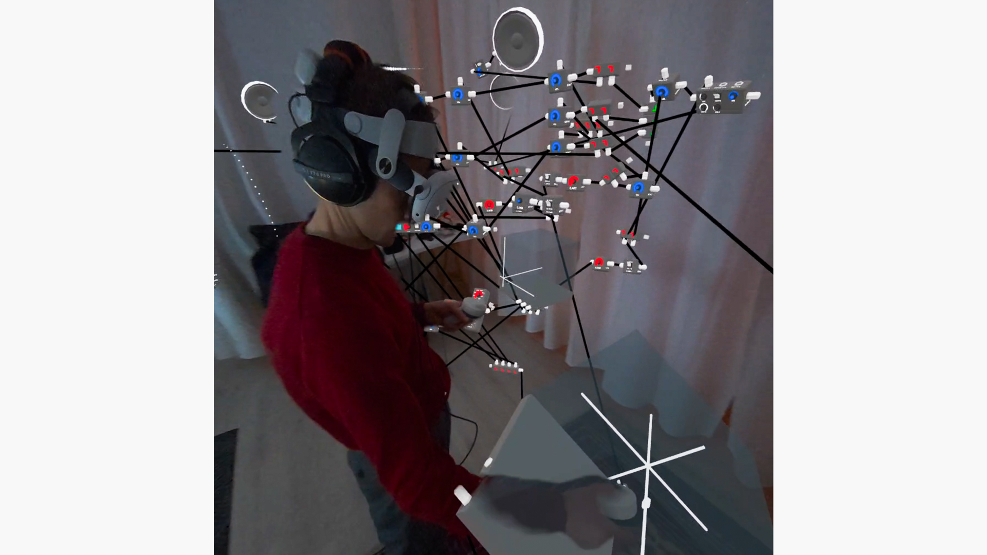 Zudem wurde die Open-Source-Anwendung OpenSoundLab, ein Mixed-Reality-Sound-Labor aus einer früheren Forschungsphase, weiterentwickelt, um Sitzungen mit mehreren Nutzer:innen sowohl lokal als auch über Distanz zu ermöglichen. Drei Künstler:innen erhielten kommerzielle XR-Headsets (Meta Quest 3) und Software, um ihre Praxis in virtuellen Umgebungen zu erproben. Dies diente auch als kulturelle «Probe», um tiefgehende Nutzer:innenerfahrungen zu erfassen.