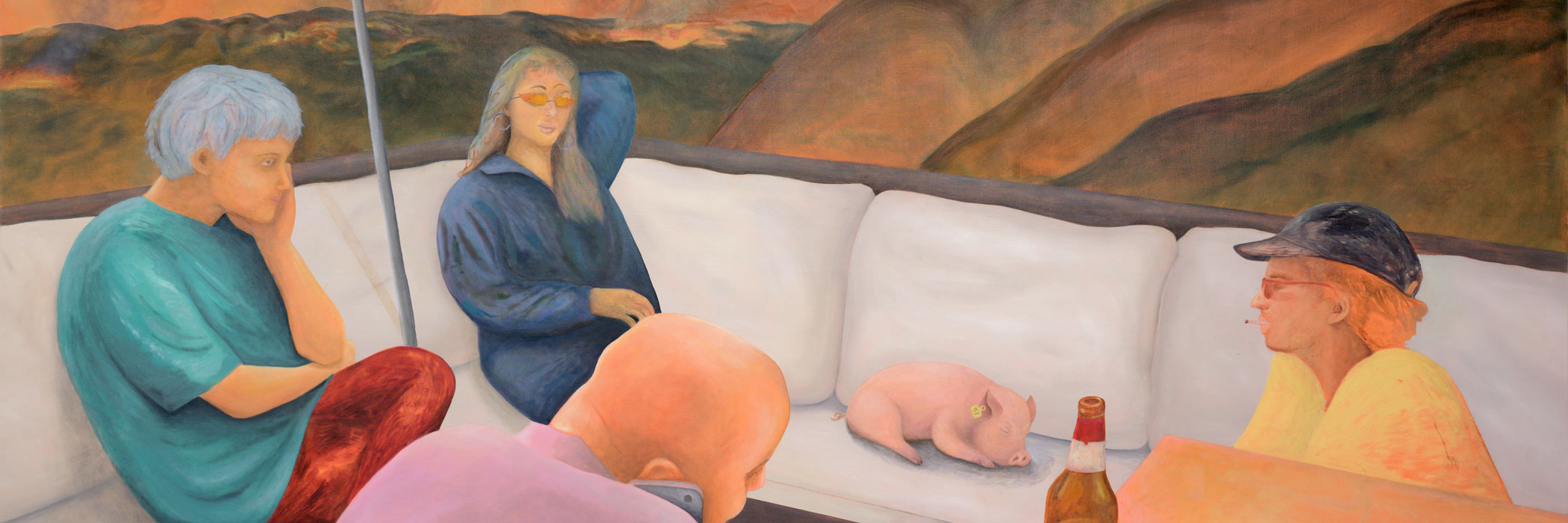 In der für diese Ausstellung entstanden Gemälden verbindet die in Basel lebende Bündner Künstlerin Motive aus der Kunstgeschichte und der Populärkultur. Themen wie Jugend, Digitalität, Ökologie und Körper fügt sie sinnbildlich zu vielschichtigen Narrationen zusammen. In ihren traumgleichen Landschaften verweilen rätselhafte Figuren, die etwa auf einer sonnigen Terrasse verweilen, Gymnastikübungen machen oder Energydrinks trinken. Die Bildwelten erinnern zuweilen an altmeisterliche Komposition, Kleidung, Körperhaltungen oder Gegenstände entstammen jedoch der aktuellen Jugendkultur. In der Verbindung von Bekanntem und Unheilvollem ergründen Naomi Pfisters Bilder, in welchen zukünftigen Formen von Gemeinschaften wir womöglich leben werden.