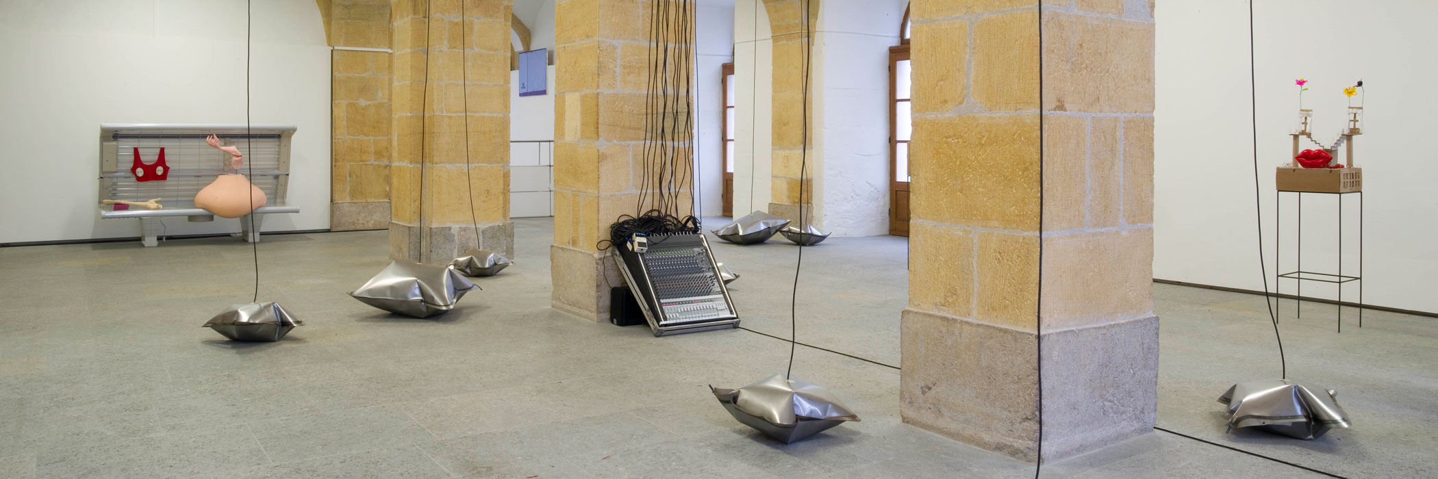 In seiner Arbeit "Why should I buy pillows when All I want Is sleep" zeigt der Künstler im Rahmen einer Boden- und Soundinstallation aus Metallblechen zusammengesetzte Kissenskulpturen.