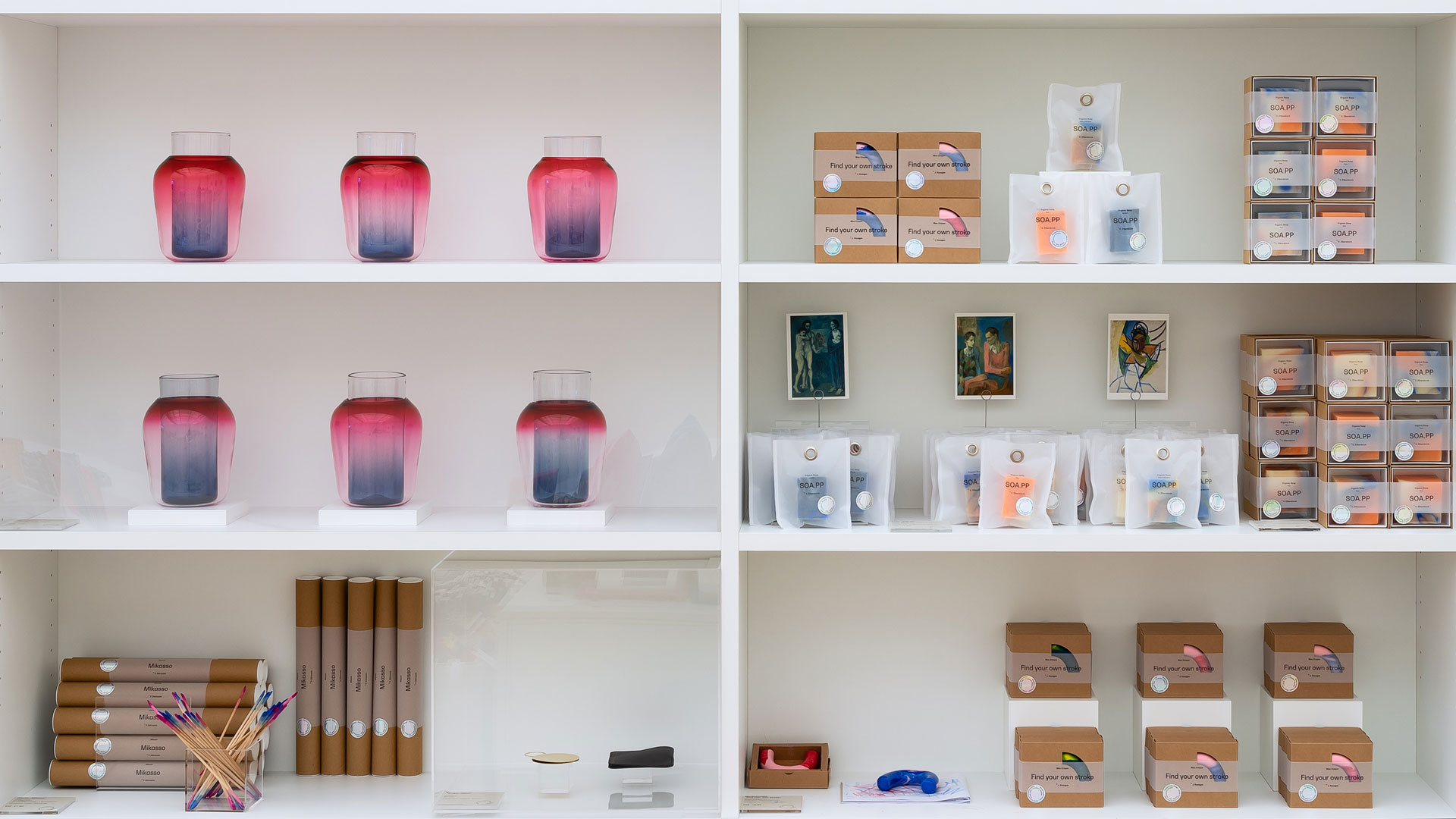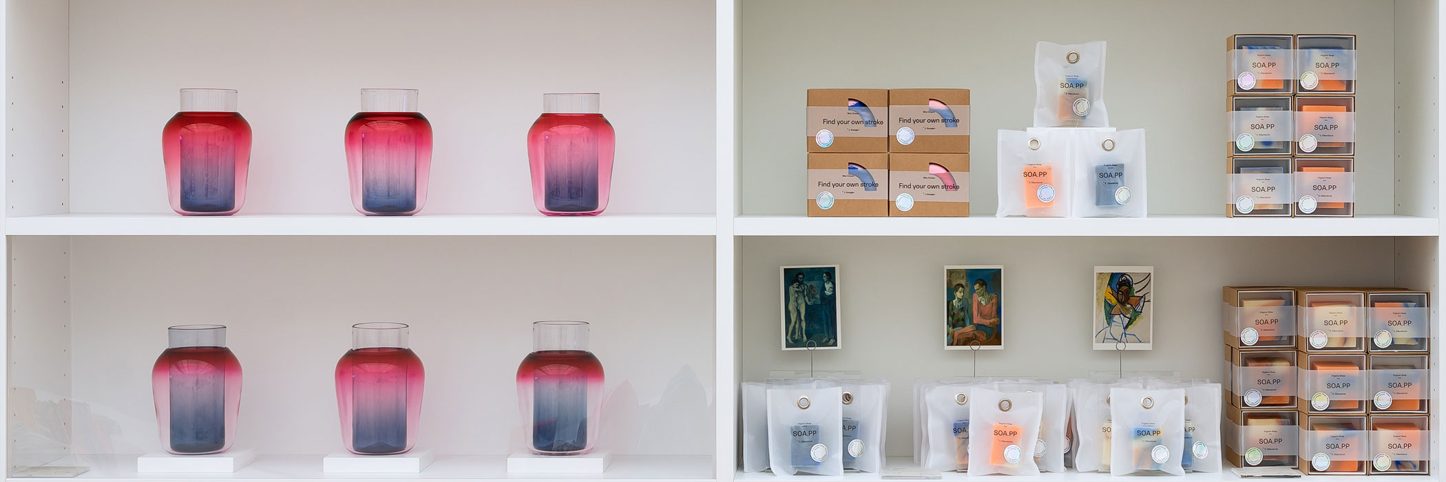 Eine fünfköpfige Jury prämierte im Herbst 2018 jene Entwürfe, die realisiert werden sollten. Insgesamt sechs verschiedene Produkte sind nun produziert worden und werden ab sofort im Picasso Shop der Fondation Beyeler angeboten. Bei den meisten handelt es sich um handgefertigte Unikate. Zu kaufen gibt es mundgeblasene Vasen, goldene Handspiegel, bunte Seifen und Wachsmalstifte, ein Mikado-Spiel und T-Shirts für Kinder – alles in einer limitierten Auflage und mit einer eigens dafür designten Verpackung.