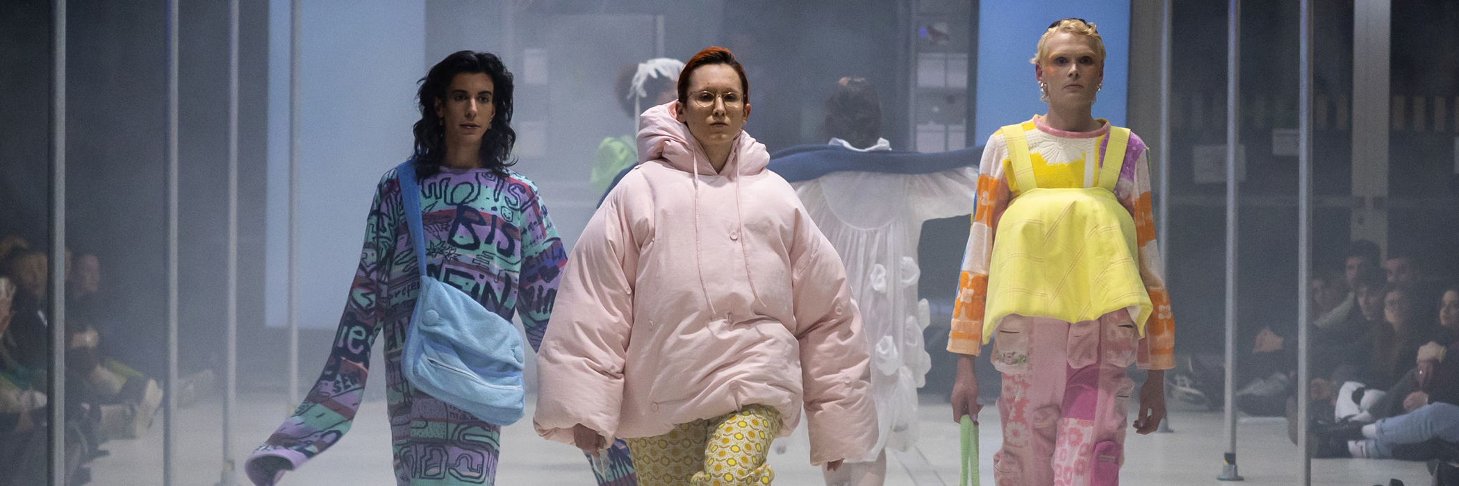 Am 11. Februar 2023 haben 23 Designer:innen des Studiengangs BA Mode-Design am Institute Contemporary Design Practices (ICDP) ihre Abschluss-Arbeiten inszeniert und performt. Der Live Act ging im Hochhaus der HGK Basel FHNW auf zwei Etagen vor mehr als 1000 Zuschauer:innen über die Bühne.