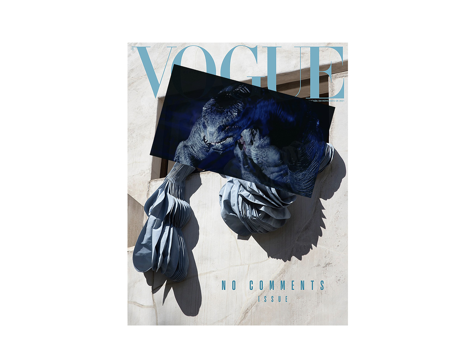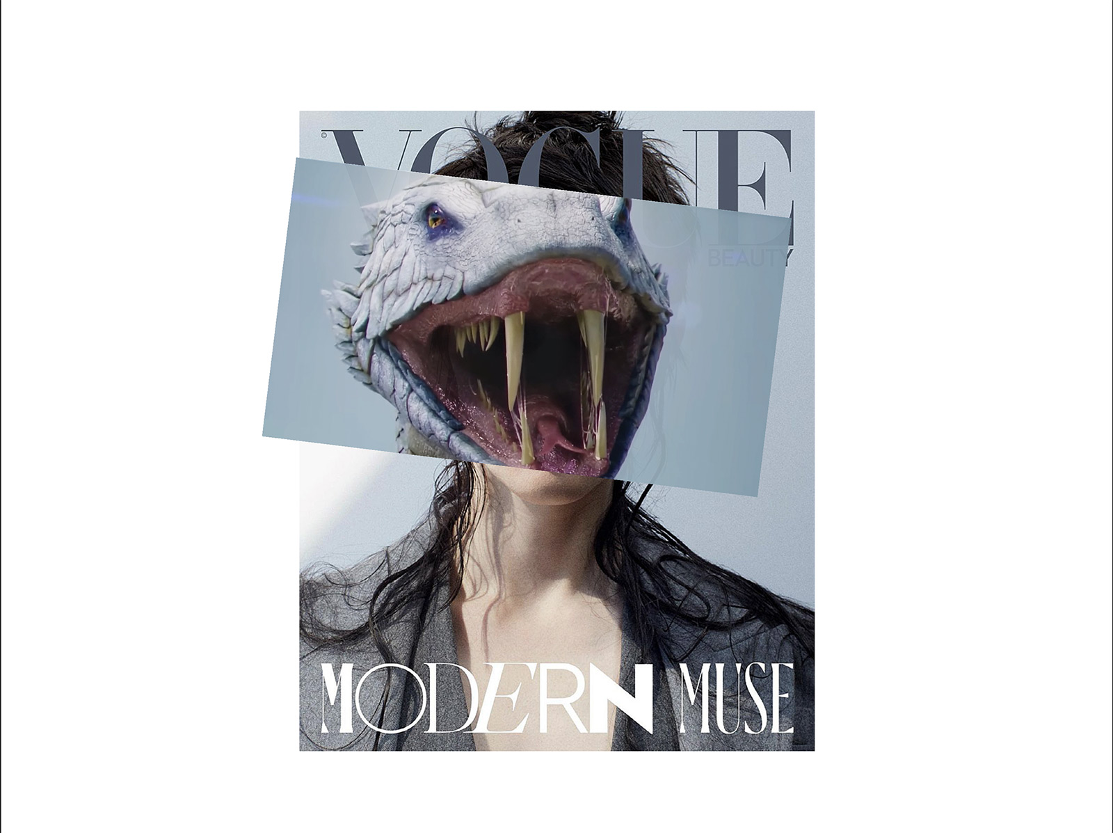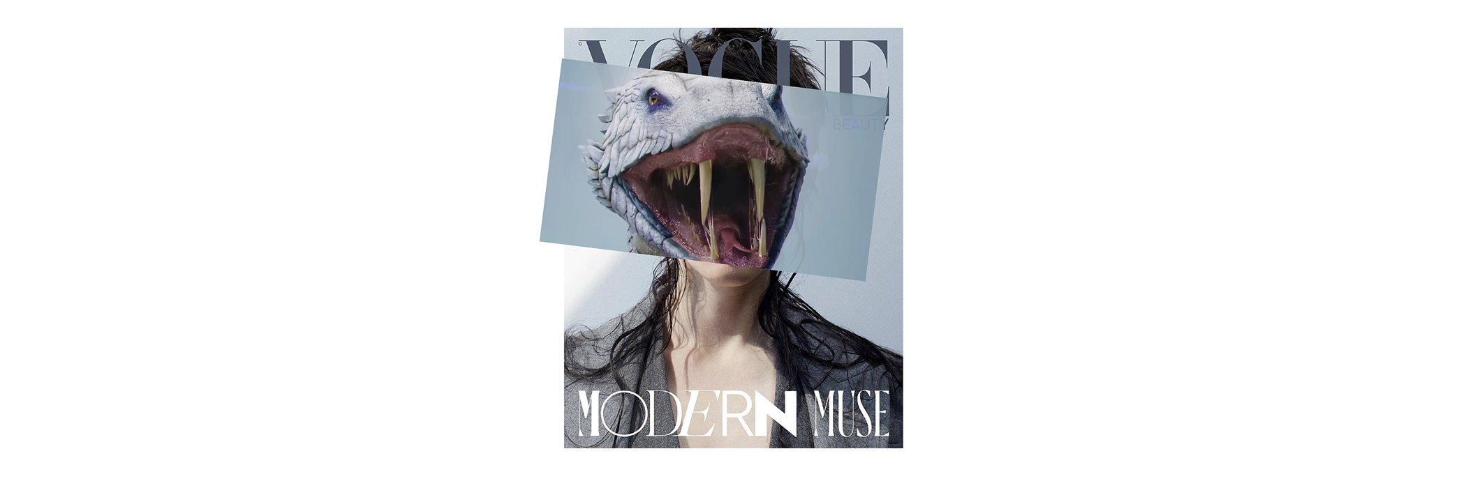 «Vogue» ist ein multimediales eBook, das aus einer Serie von audiovisuellen Collagen besteht. Es titelt 39 Namen, wie Frank, Klara, Tadeusz, Hector, Cleo oder Yuto. Jeder Name führt zu einer Seite mit einem Vogue-Cover, doch die statischen Gesichter auf den Titelbildern sind verdeckt und durch animierte Kreaturen aus Science-Fiction- und Horrorfilmen ersetzt. Es sind in Dauerloop befangene Kreaturen, hybride Identitäten, halb Mensch, halb Tier, halb Maschine.