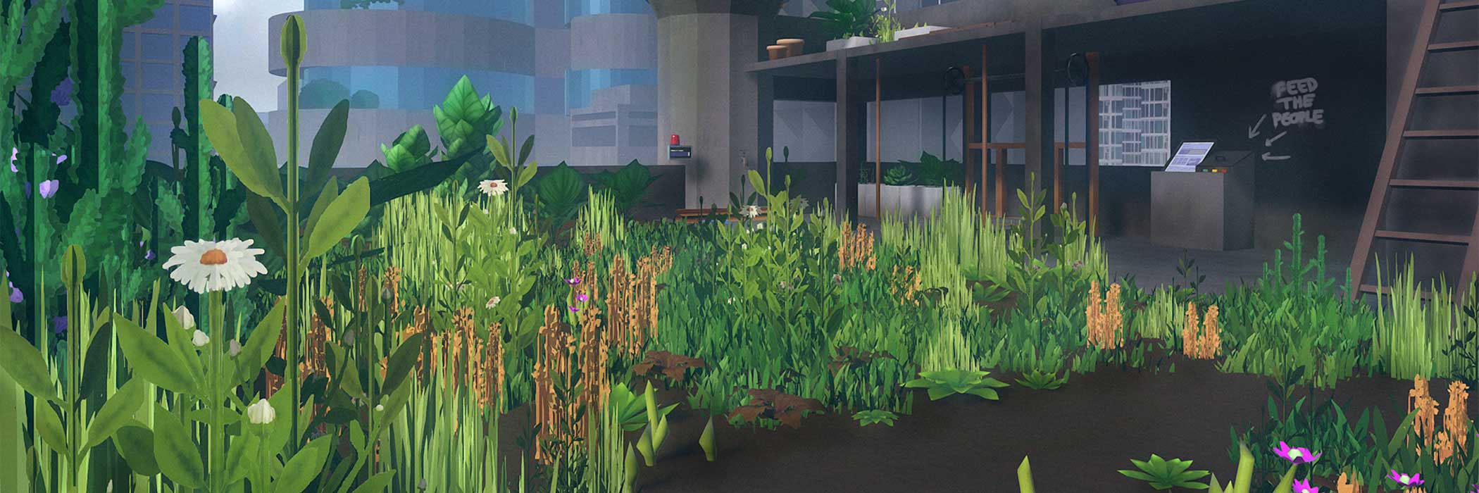 «Skyfarm» spielt auf dem Dach eines Wolkenkratzers einer überfluteten Megacity. Die Spielenden haben die Aufgabe, ihren Garten zu pflegen, Lebensmittel zu ernten und die Biodiversität zu erhöhen. Durch Tauschhandel können sie Materialien mit anderen Dachgärtner:innen tauschen, um neue Pflanzen und Gartenelemente freizuschalten. Die Grundlage von «Skyfarm» hat Lena Frei im Rahmen einer Weiterbildung im FHNW-Förderprogramm Incubator for Design Cultures entwickelt.