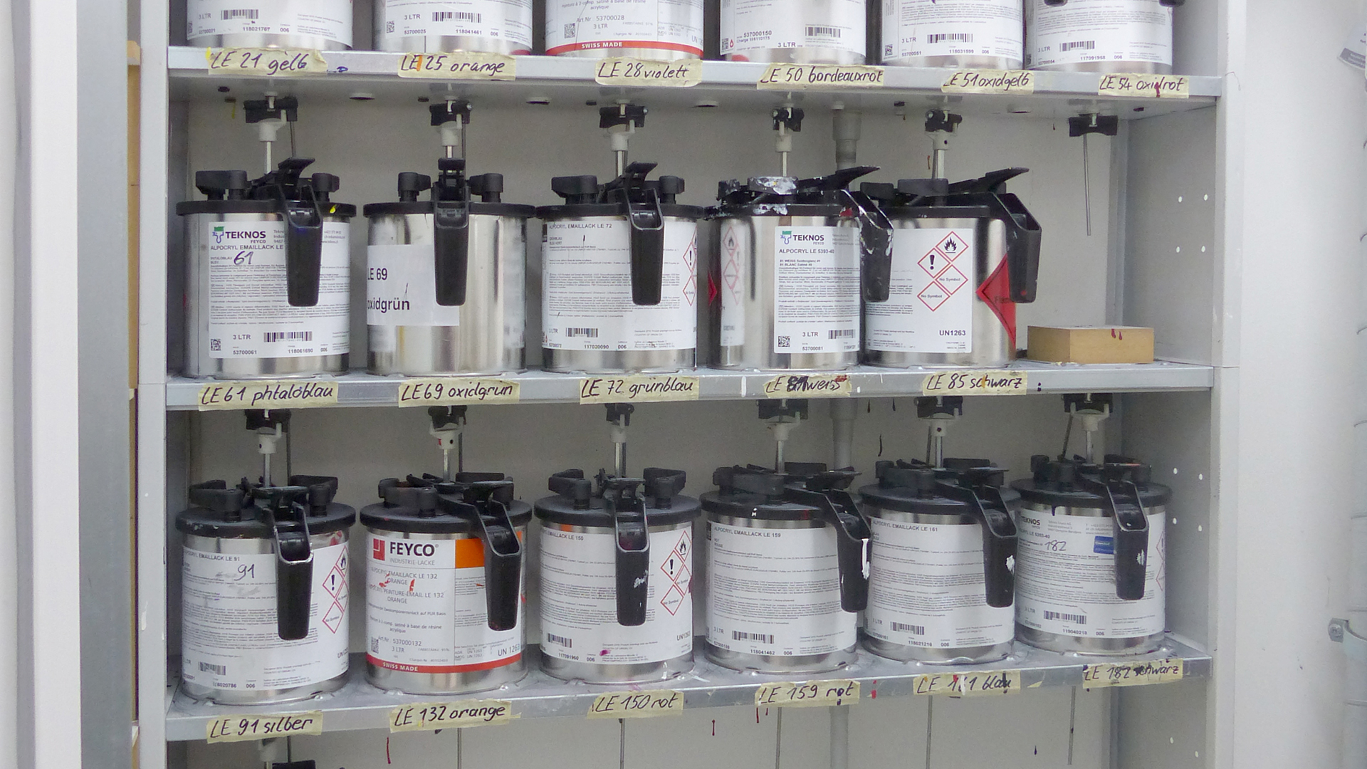 Dank der Absauganlage kann sowohl mit wasserlöslichen wie lösemittelhaltigen Farben gearbeitet werden, die mit Spraydosen oder Lackierpistolen aufgetragen werden. Ein professionelles Mischsystem ermöglichte das Anmischen der Farben nach RAL, NCS und so weiter.