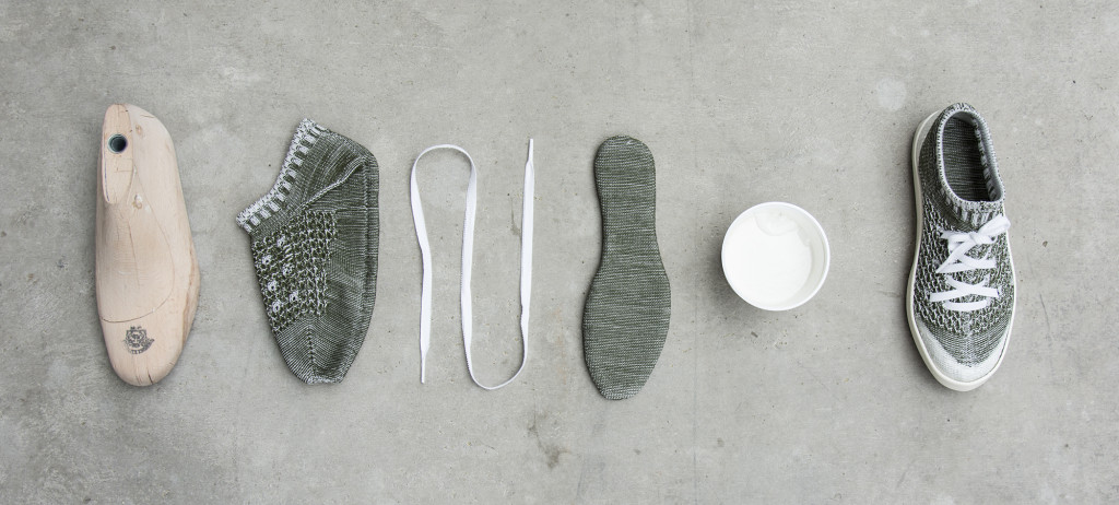 Mit Ausnahme der Sohle ist der komplette Schuh 3-D-gestrickt. Durch ein spezielles Verfahren wird die Sohle direkt an den Schaft gespritzt. Die Produktion erzeugt keine Materialreste und es werden rezyklierte Garne und Kunststoffe eingesetzt. Die Herstellung erfolgt in wenigen Arbeitsschritten. Somit ist der Schuh in der Schweiz produzierbar, was dem Leitfaden von Freitag entspricht. Zum lebhaften Strickmuster stellt die reduzierte Sohle einen Kontrast dar. Der leichte Alltagsschuh steht für den schonenden Umgang mit Ressourcen.