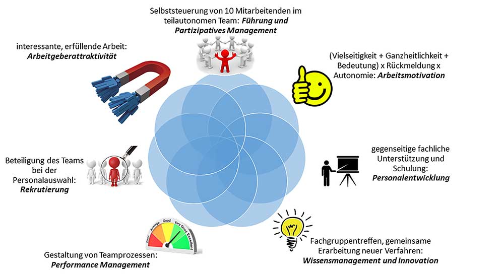 Die Abbildung illustriert am Fall eines Schweizer Kleinunternehmens, wie durch die Einführung eines teilautonomen Produktions- und Entwicklungsteams mehrere Felder des Personalmanagements entwickelt werden konnten. Da die einzelnen Aktivitäten miteinander in Verbindung stehen, verstärken sich diese gegen-seitig.
