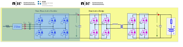Es wird ein galvanisch isolierter SiC-AC/DC-Konverter entwickelt, der aus einem dreiphasigen aktiven Gleichrichter sowie einem Dual-Active-Bridge (DAB) DC/DC-Konverter aufgebaut ist. Der bidirektionale Leistungsfluss ermöglicht Anwendungen, wie z.B. die effiziente Netzanbindung von Batteriespeichern (siehe Abbildung 1).