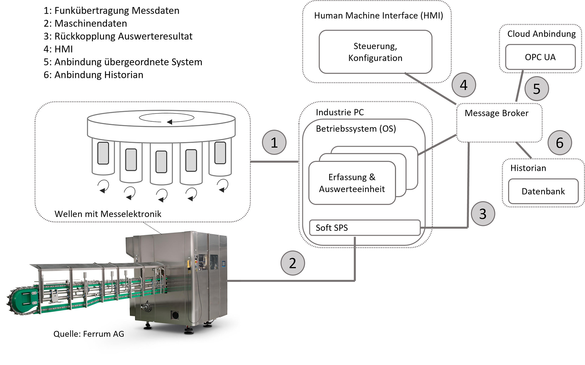 Die Dosenverschliesser von Ferrum Packaging AG bestehen aus mehreren, rotierenden Wellen zum Verschliessen von Dosen mit Durchsätzen bis 2500 Dosen / Minute. Diese sind mit einer eigenen Messelektronik ausgerüstet. Die Messdaten werden aus dem Maschinengehäuse an einen Industrie-PC übertragen und ausgewertet. Weist das Resultat auf einen fehlerhaften Dosenverschluss hin, wird diese Dose aus dem Produktionsprozess entfernt.
