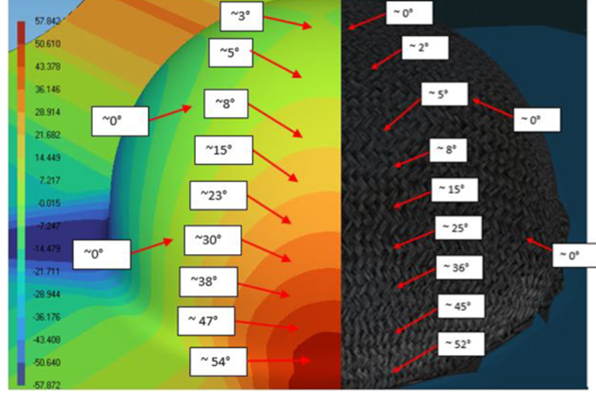 Die kinematische Simulation kann Scherwinkel berechnen und aussagekräftige Ergebnisse unter bestimmten Bedingungen liefern, z. B. wenn der Drapierungsprozess von einem klar definierten Keimpunkt aus beginnt. Wenn das Drapieren von einer Linie aus beginnt, wie im Fall der Doppelkuppel, liefert die kinematische Simulation nur dann aussagekräftige Werte, wenn die textile Richtung parallel zu dieser Startlinie (Saatlinie) verläuft. Der grosse Vorteil der kinematischen Simulation ist die sehr schnelle Rechenzeit, die typischerweise zwischen 10 und 60 Sekunden liegt. Wenn es sich um komplexe Geometrien handelt, empfiehlt es sich, eine numerische Simulation durchzuführen, die verschiedene Drapierungsphänomene und Defekte visualisieren kann. Textilspezifische Eingangsparameter, einschliesslich der Schubsteifigkeit und der Biegesteifigkeit, sind jedoch für numerische Simulationen unerlässlich.