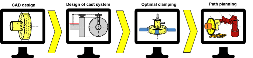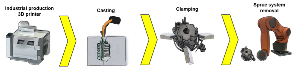 Zuerst wird der digitale Entwurf des Gussstücks und danach die Sandgussform für den Rohling mit einem 3D-Sandformdrucker erstellt. Der Mitarbeiter startet nach dem Giessen den Entgratungsprozess auf Basis der Daten, welche mit Hilfe des digitalen Zwillings berechnet wurden. Während dieses Prozesses werden die kleinen Positionsfehler aufgezeichnet und in situ kompensiert. Das Angusssystem wird anschliessend robotergestützt vom Gussstück abgetrennt und entfernt, der Rohling steht für die weitere Verwendung bereit.