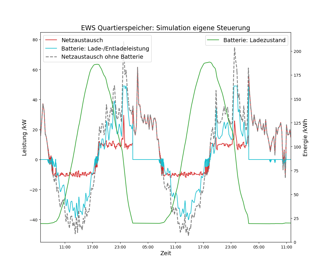 Ein Quartierspeicher basierend auf einer Lithium-Ionen-Batterie, eine Photovoltaikanlage und 15 Wohnungen bilden zusammen eine Einheit, die mit dem elektrischen Verteilnetz Energie austauscht. Der vom Batterie-Hersteller vorgegebene Steuerungsmodus «Eigenverbrauchsoptimierung» ist aus Sicht des Verteilnetzbetreibers sowohl unter technischen wie wirtschaftlichen Aspekten nicht ideal. Die Eigenverbrauchsoptimierung fokussiert auf dem gemittelten Energieaustausch mit dem Netz während für den Verteilnetzbetreiber unter anderem der maximale Leistungsaustausch mit dem lokalen Netz die relevantere Grösse ist.