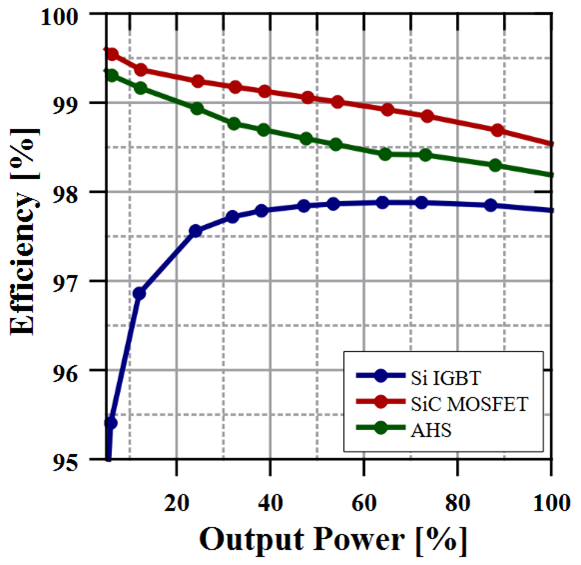 In der AHS-Topologie (Adjustable Hybrid Switch) ist ein SiC-MOSFET parallel zu einem Si-IGBT für den Wechselrichterschalter geschaltet, und die Geräte werden je nach Strombedarf sequentiell geschaltet. Das bietet einen tollen Kompromiss zwischen geringeren Kosten und höherer Energieeffizienz.