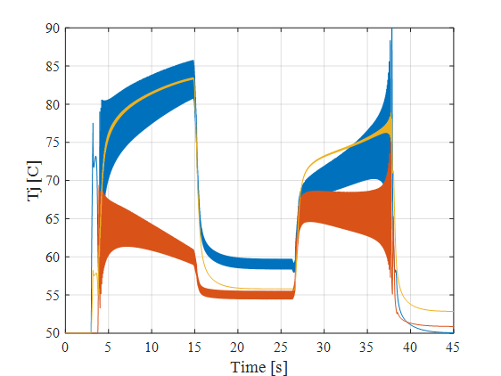 Es wird eine Zuverlässigkeitsstudie von Leistungshalbleiter-Bauelementen in einer Elektrofahrzeug-Anwendung durchgeführt, basierend auf einem Fahrzyklus-Missionsprofil. Ein Fahrzyklus mit der Geschwindigkeit des Fahrzeugs (km/h) als Funktion der Zeit wird in das Drehmoment und die Drehzahl der Motorwelle umgewandelt, was als Eingangs-Profil für die elektrische Simulation dient. Diese enthält die elektrothermischen Modelle und Datenblattparameter der Leistungshalbleiter. Als Ergebnis wird die thermische Belastung des Transistors/der Diode für die beiden Topologien (IGBT/Diode uns MOSFET) berechnet. Das thermische Verhalten für das gegebene Einsatzprofil ist in Abb. 3. dargestellt. Folgendes ist zu beobachten: