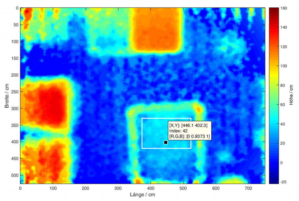 Abbildung 2: Die Aufnahme der “Time of Flight”-Kamera zeigt den Füllstand mehrerer Container (blau = leer, rot = voll) Quelle: FHNW