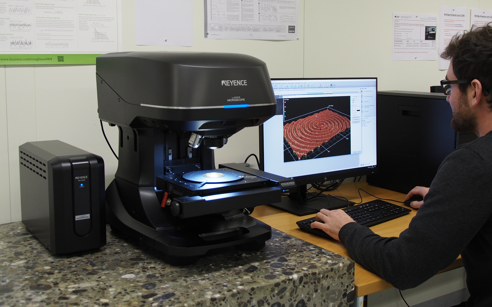 Die Messungen erfolgen vollautomatisch per motorisiertem Probentisch, gesteuert über eine eigene leistungsfähige Workstation. Das Mikroskop bietet auch einen signifikanten Geschwindigkeitsgewinn. Einzelne lokale Flächenmessungen mit Hilfe des Lasers sind innerhalb von wenigen Sekunden statt wie bisher innerhalb von Minuten durchgeführt. Für grössere Flächen werden mehrere Messungen zusammengesetzt („stitchen“). Zudem ist keine spezielle Probenvorbereitung notwendig und auch transparente Materialien können vermessen werden. Eine Beschädigung der untersuchten Messobjekte ist dabei durch das kontaktlose Messprinzip ausgeschlossen.