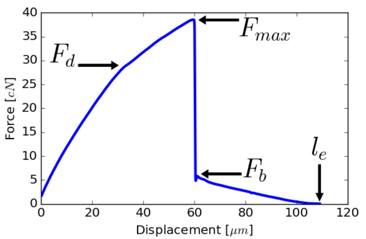 In Diagramm 1 ist eine typische Kraft/Auslenkungskurve gezeigt, wie sie aus dem FIMATEST System erhalten wird. Zu Beginn der Messung steigt die Spannung gegenüber der Auslenkung rasch an und zeigt bei der Kraft Fd («debonding force») einen kleinen Knick. An diesem Punkt wird aufgrund der Spannungswirkung der Faser-Matrix-Bruch initiiert. Ab diesem Punkt wird die Spannung mit geringerer Steigung weiter erhöht. Dies aufgrund der zusätzlichen Reibungskräfte zwischen dem gelösten Teil der Faser und der Matrix. Der Bruch schreitet nun weiter voran, bis die Kraft Fmax erreicht wird. An diesem Punkt ist die Faser komplett von der Matrix gelöst, die Kraft geht deutlich zurück und die Faser kann mit der geringeren Kraft Fb, die der Reibungskraft entspricht, aus der Matrix gezogen werden. Sobald diese Kraft Fb auf 0 N zurückgegangen ist, wurde die Faser mit der kompletten Länge (le) aus der Matrix gezogen.