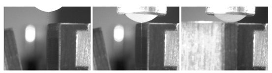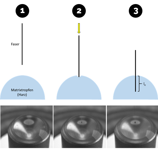 Die Probenherstellung im FIMABOND-Gerät (Bild 1) ist der kritischste Teil der Prüfung. Die Einzelfaser muss zentral am höchsten Punkt des Harz-Tropfens platziert werden und dort während der Härtung (Duromere) oder Abkühlung (Thermoplaste) in der Matrix verbleiben. Die Positionierung ist entscheidend, um verlässliche Ergebnisse zu erhalten, die frei von unerwünschten Scherkräften sind. Bild 2 zeigt, wie zuerst die Einzelfaser einem flüssigen Epoxidharz-Tropfen angenähert wird (links). Im mittleren Bild sieht man, wie die Faser mit der Matrix in Kontakt kommt und schliesslich in das Harz eintaucht und während der Aushärtung fixiert wird (rechts).