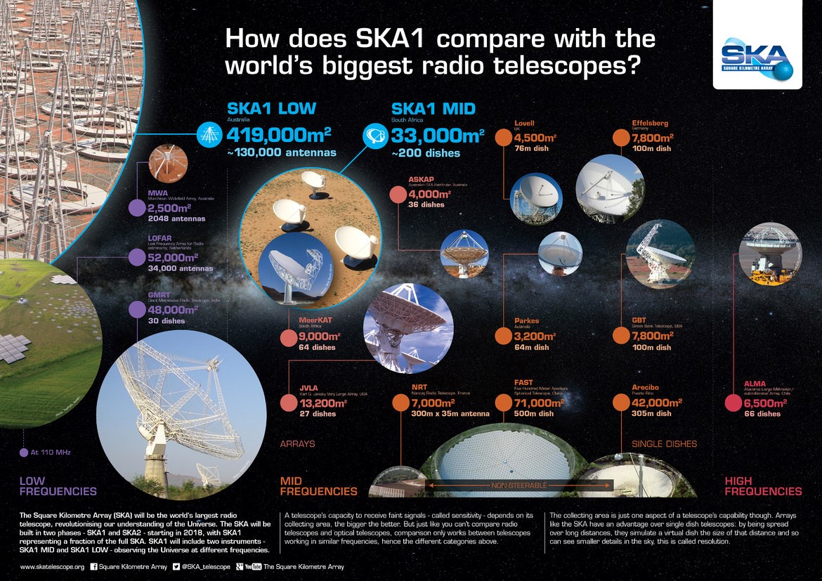 Mit dem SKA wird man Radiowellen in tiefen und mittleren Frequenzbereichen in enormer Auflösung messen können. Damit kann man diverse wissenschaftliche Rätsel wie Schwarze Löcher, Gravitationsfelder oder dunkle Energie erforschen.
