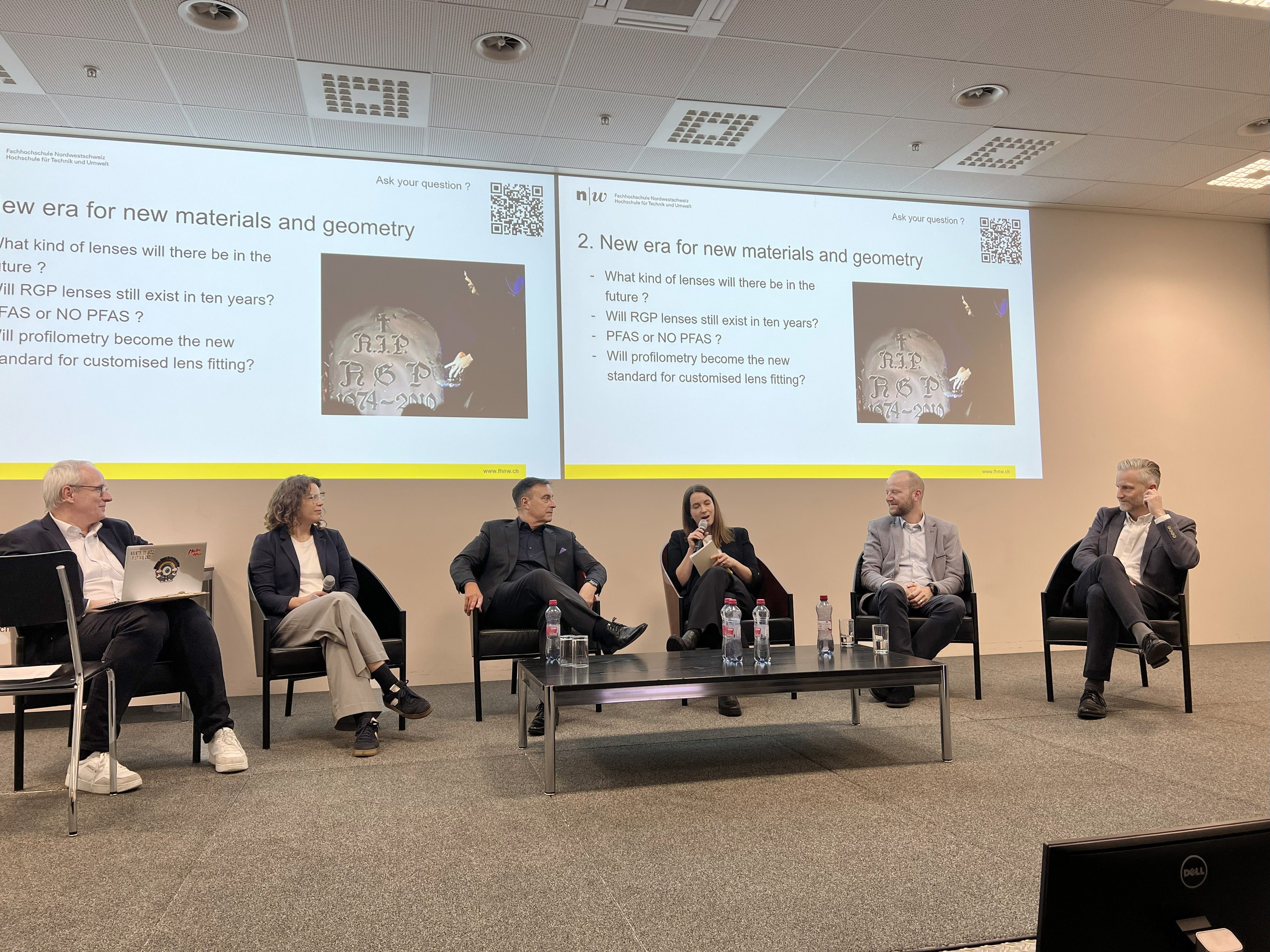 In der anschliessenden Paneldiskussion mit Branchenexpertinnen und -experten Sarah Ven (AOR), Seonaid Collins (Optometriezentrum Basel), Daniel Ulrich (J&J Vision), Daniel Roos (Alcon) und Philippe Seira (FHNW) wurde die Bedeutung von Forschung, Ausbildung und Verantwortung in der Anwendung neuer Technologien hervorgehoben.