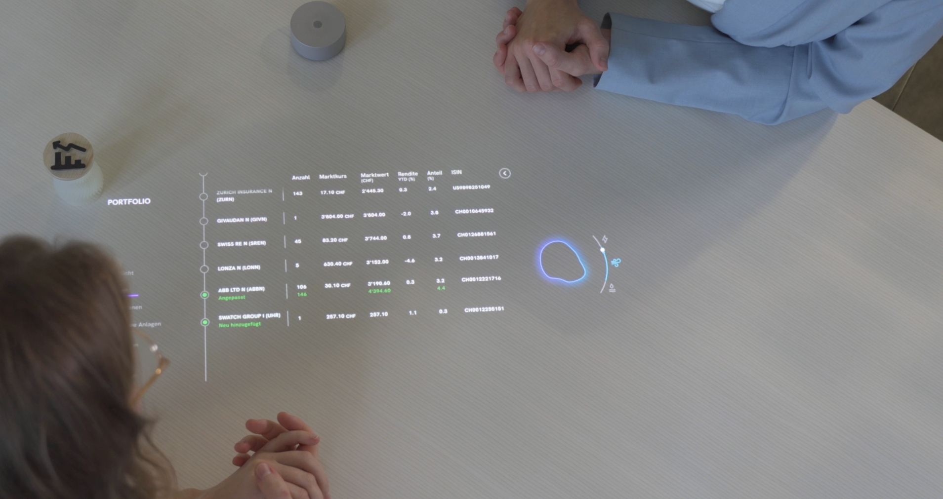Der entwickelte Agent «Mo» versteht und spricht Schweizerdeutsch und erfasst beispielsweise Eckdaten, die der Kunde oder die Kundin nennt, oder passt das Portfolio basierend auf deren Bedürfnissen und Interessen an. Gleichzeitig bietet «Mo» visuelle Unterstützung des Prozesses: Statt auf einem Bildschirm projiziert das entwickelte System beispielsweise Grafiken oder Texte auf den Tisch.
