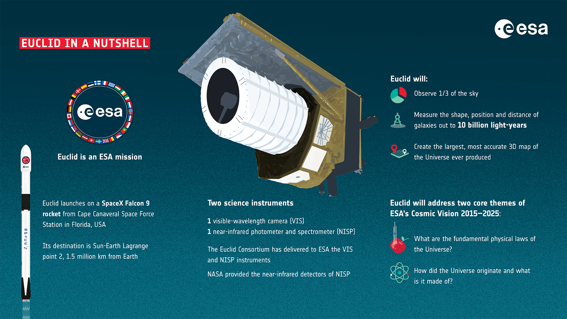 Auf Euclid befinden sich ein Teleskop mit 1.2 Metern Durchmesser und zwei wissenschaftliche Instrumente: Eine Kamera für den sichtbaren Wellenlängenbereich (VIS) und einen Spektrometer und Photometer für den nahen Infrarotbereich (NISP). Damit wollen die Forschenden eine Karte des Universums erstellen, zusammengesetzt aus Milliarden von Galaxien bis zu 10 Milliarden Lichtjahren Entfernung. Die Karte soll mehr als einen Drittel des Himmels abdecken.